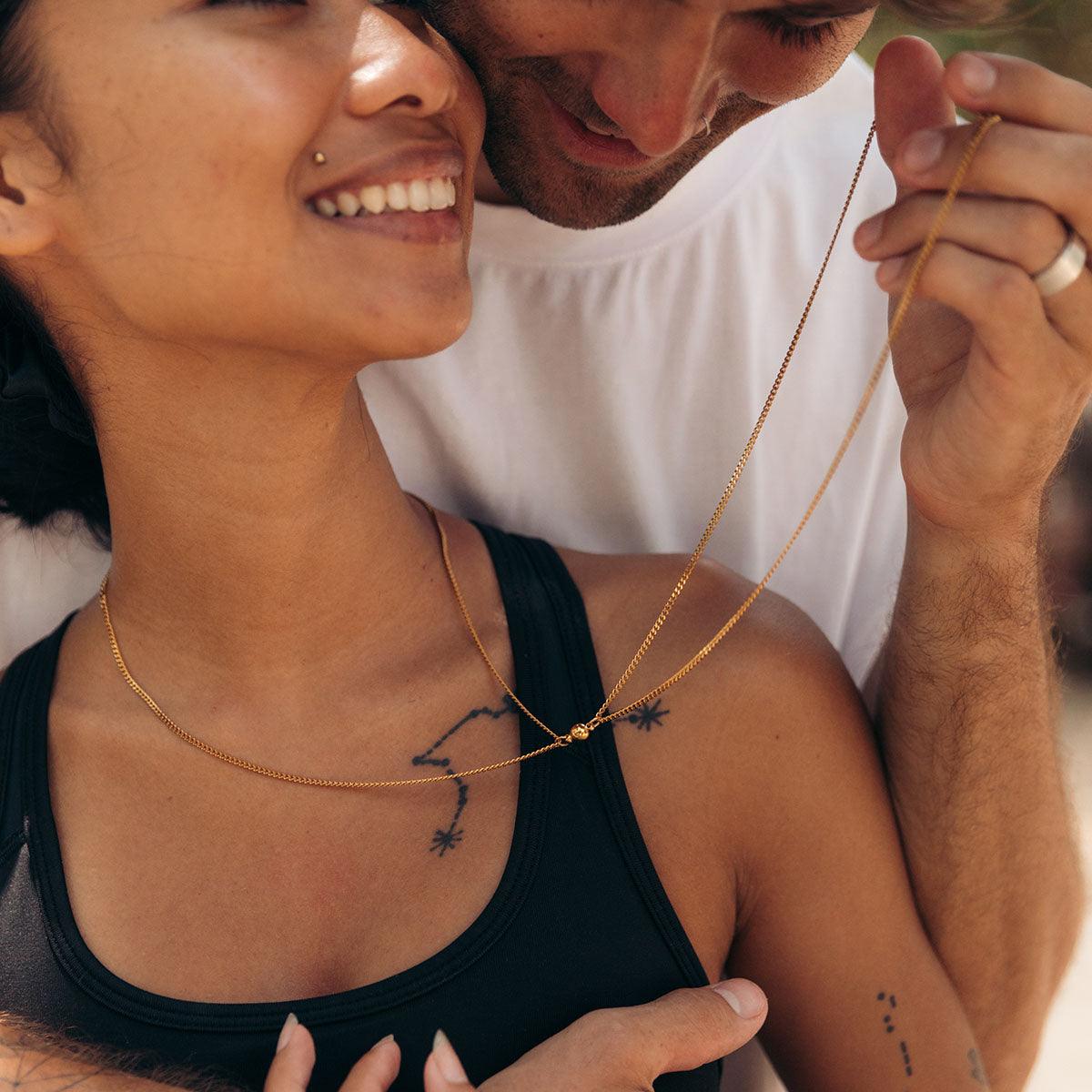 Crafted with meticulous care and designed to withstand the test of time, this jewelry will become part of you and your partners every day wardrobe. With the Customcuff Chain Magnetic Necklace Set, you and your loved one will have a constant reminder of the love, joy, and memories you've created together, and will be there for all of the new memories to be had.