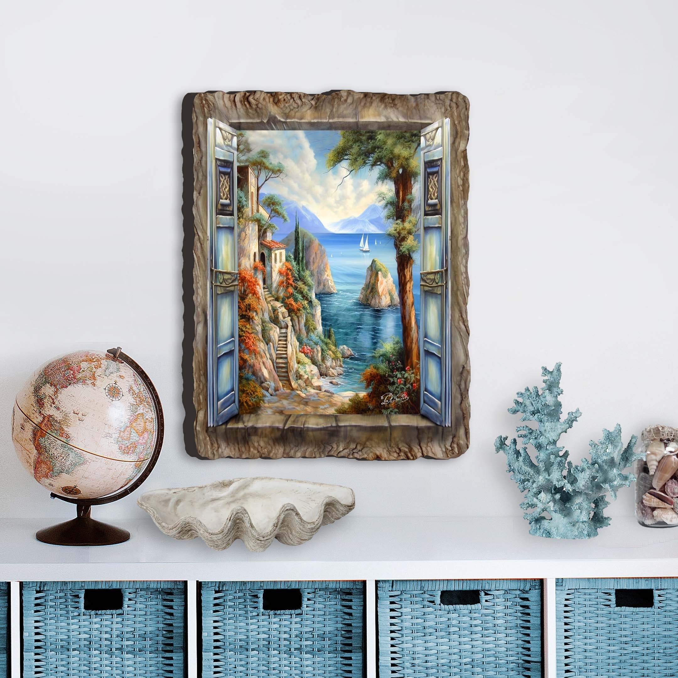 Add a touch of seaside charm to your space with the Mediterranean View Wall Art by G. DeBrekht. This coastal Decor piece features a tranquil seaside view through a window, perfect for creating a calming and serene atmosphere. This beautiful wall art brings a piece of the ocean into your home.
