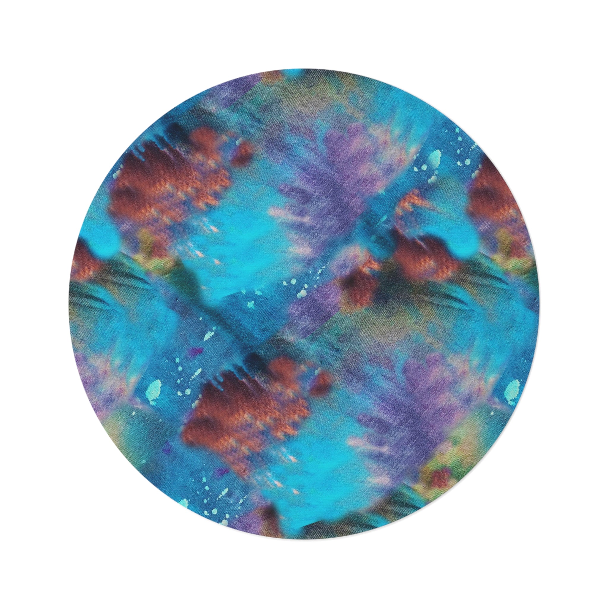 Decorative rugs with fun, bright designs put the soles at ease. This original hand-painted print is inspired by a journey. It features a coated backing and hemmed edges for durability.