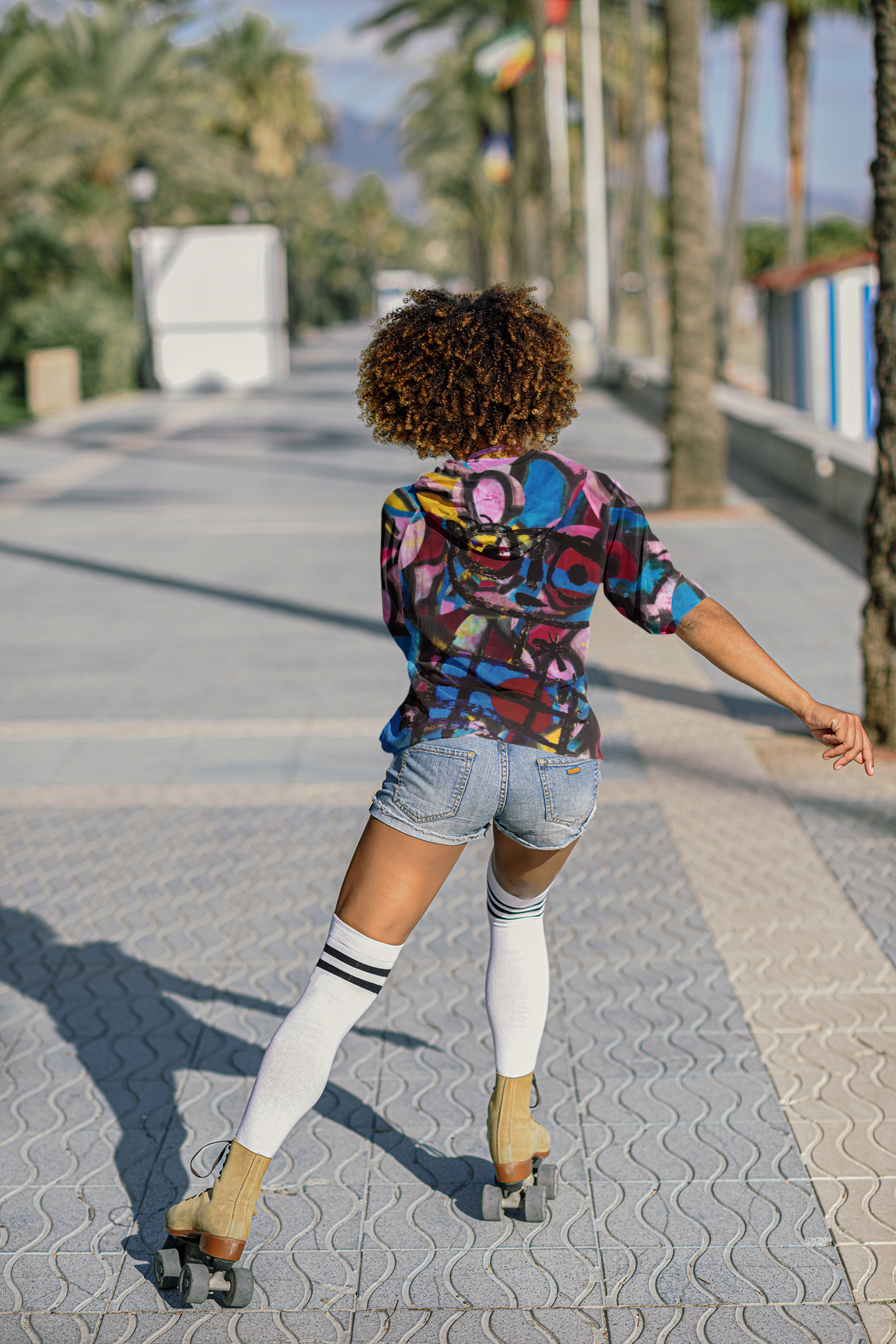This zipped fleece jacket will keep you nice and toasty through the cold. Fully covered in an original art print inspired by the great Miro. A hand painted canvas rendition. It has a large front fleece lined pocket, black zipper, a roomy hood and is custom cut and sewn. It’s your perfect pick this winter.