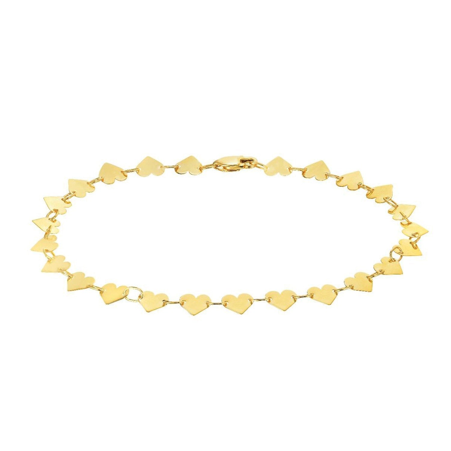 Delicate hearts shine as they dance gracefully along this finely crafted 7 1/4 inches chain bracelet, capturing the light with every movement and casting playful reflections. This 10k yellow gold piece stands as a testament to love and exquisite artistry, making it an ideal gift for someone special or a treasured addition to your collection. Each heart mirrors inner beauty and elegance, embodying timeless charm and grace.