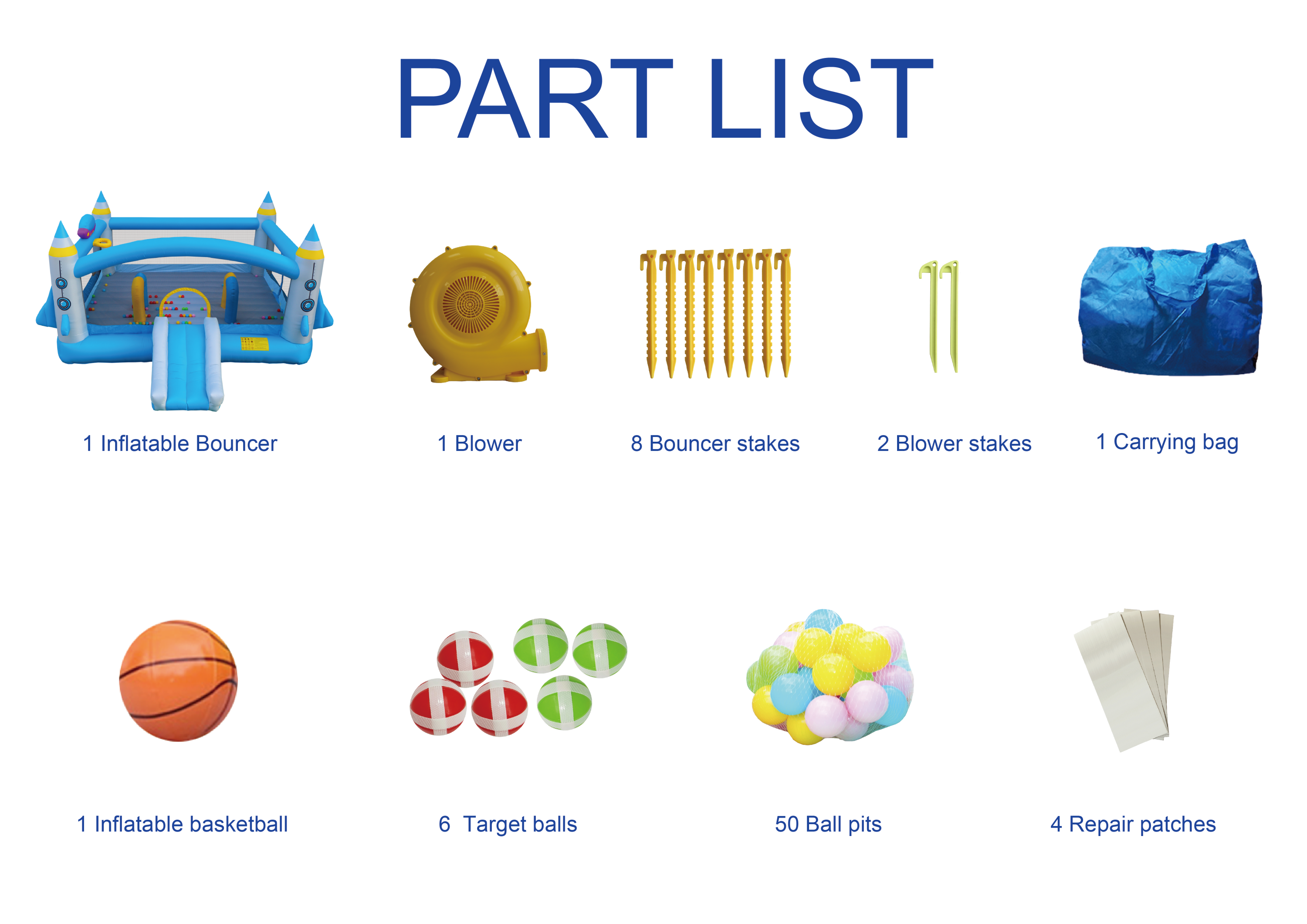 We have equipped this inflatable bouncer with a wealth of accessories. The ground nails for fixing the entire play house, the balls for playing, the daily storage bag, and the accidental damage repair bag. Complete considerate design can make this bounce house and its joy remain long-lasting.