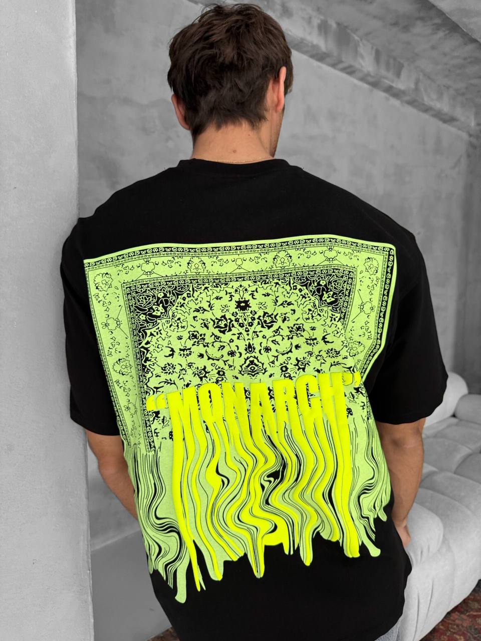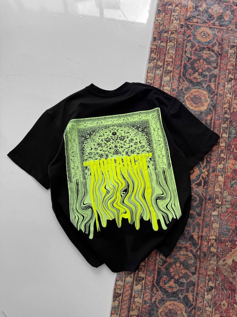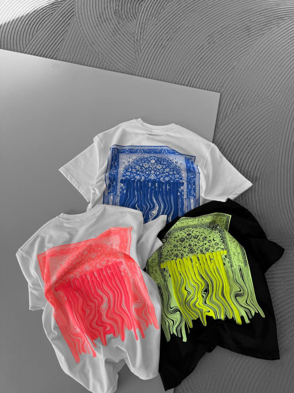 Each t-shirt showcases a neon back graphic with a melting rug-style design, blending traditional motifs with modern urban edge.