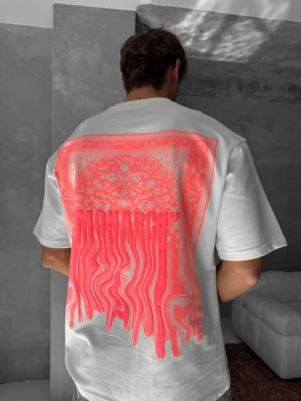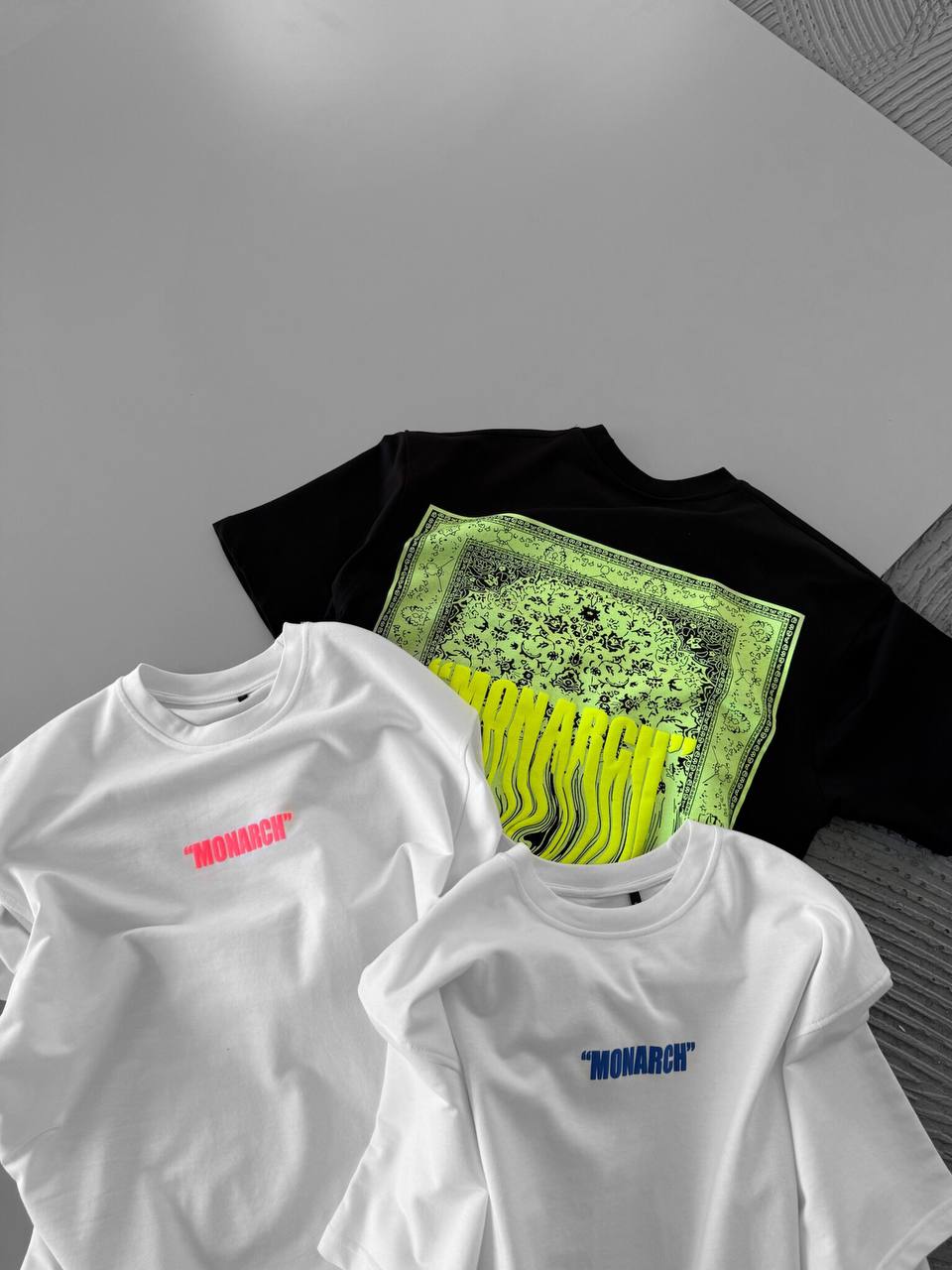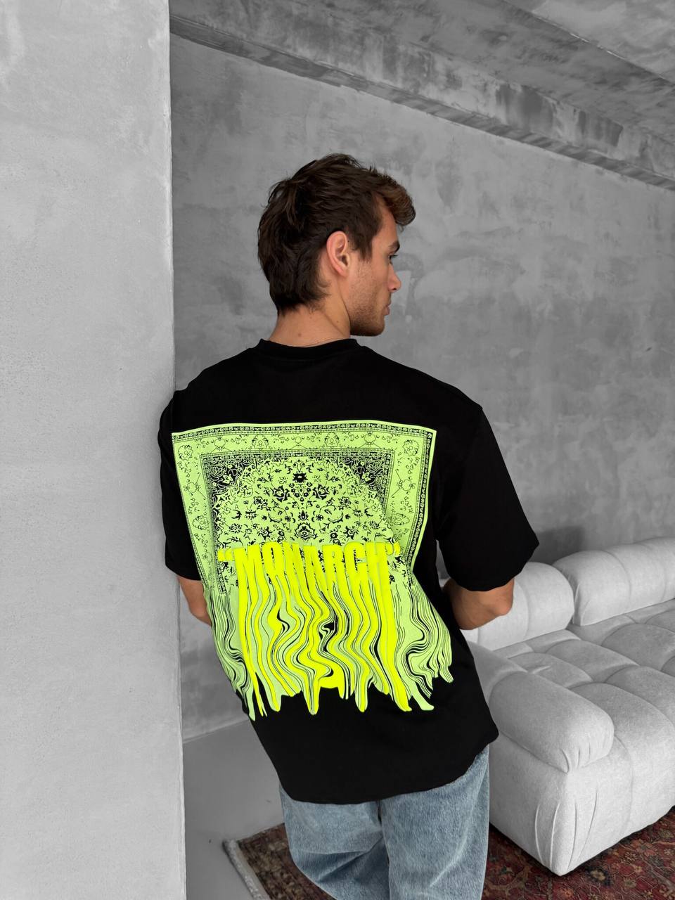 Each t-shirt showcases a neon back graphic with a melting rug-style design, blending traditional motifs with modern urban edge.