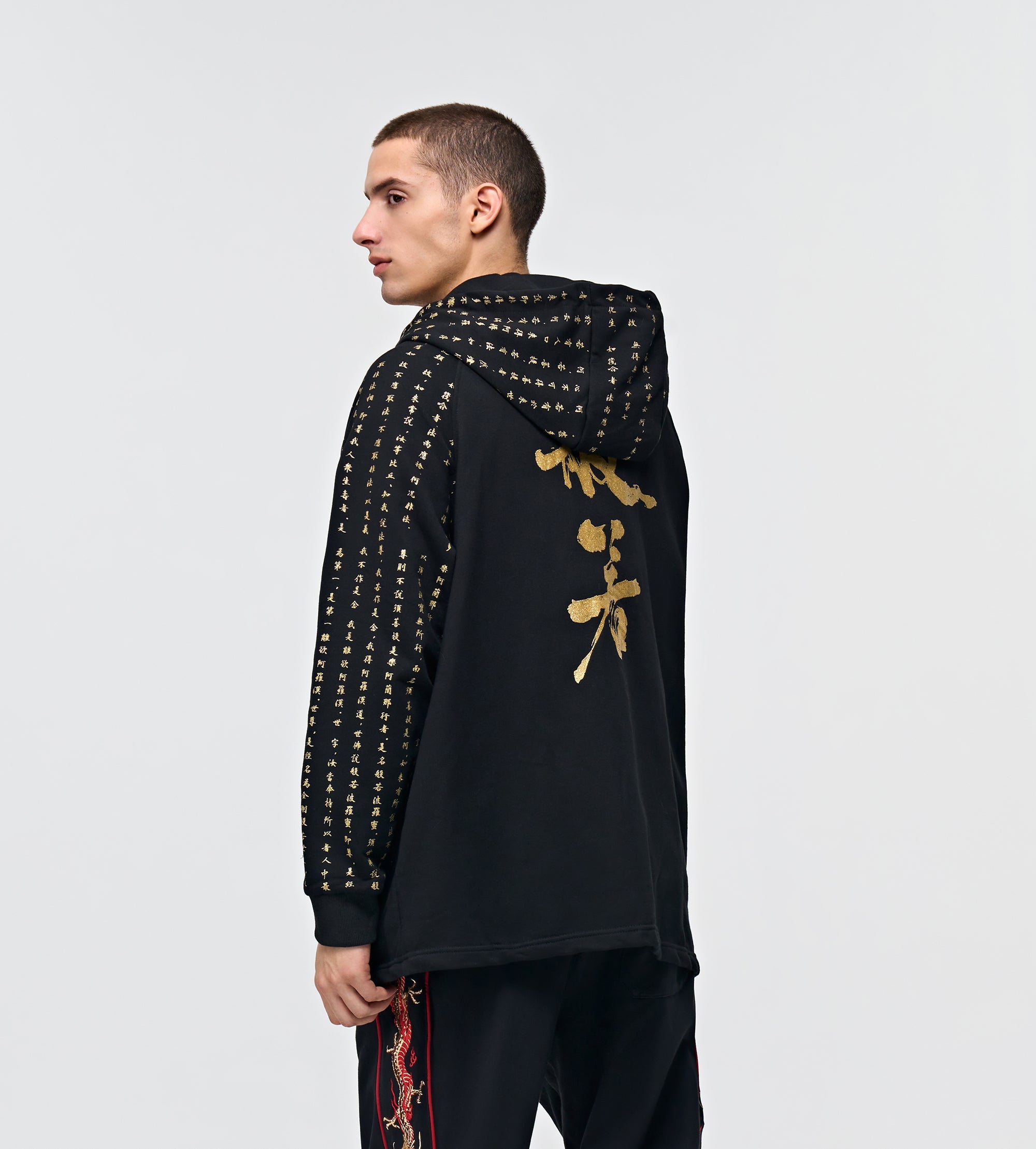 - Gold screen print Japanese kanji design going down both sleeves and hoodie