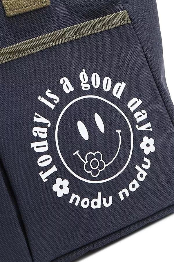 This stylish canvas tote handbag features a durable canvas construction. The bag showcases a fun smiley face graphic with text design on the front, making it perfect for casual everyday use. With its spacious main compartment and convenient front pocket, this tote offers both functionality and style. The reinforced handles ensure comfortable carrying, while the lightweight canvas material makes it ideal for work, school, shopping, or leisure activities. The classic tote silhouette combined with the playful graphic design creates a perfect balance of practicality and personality.