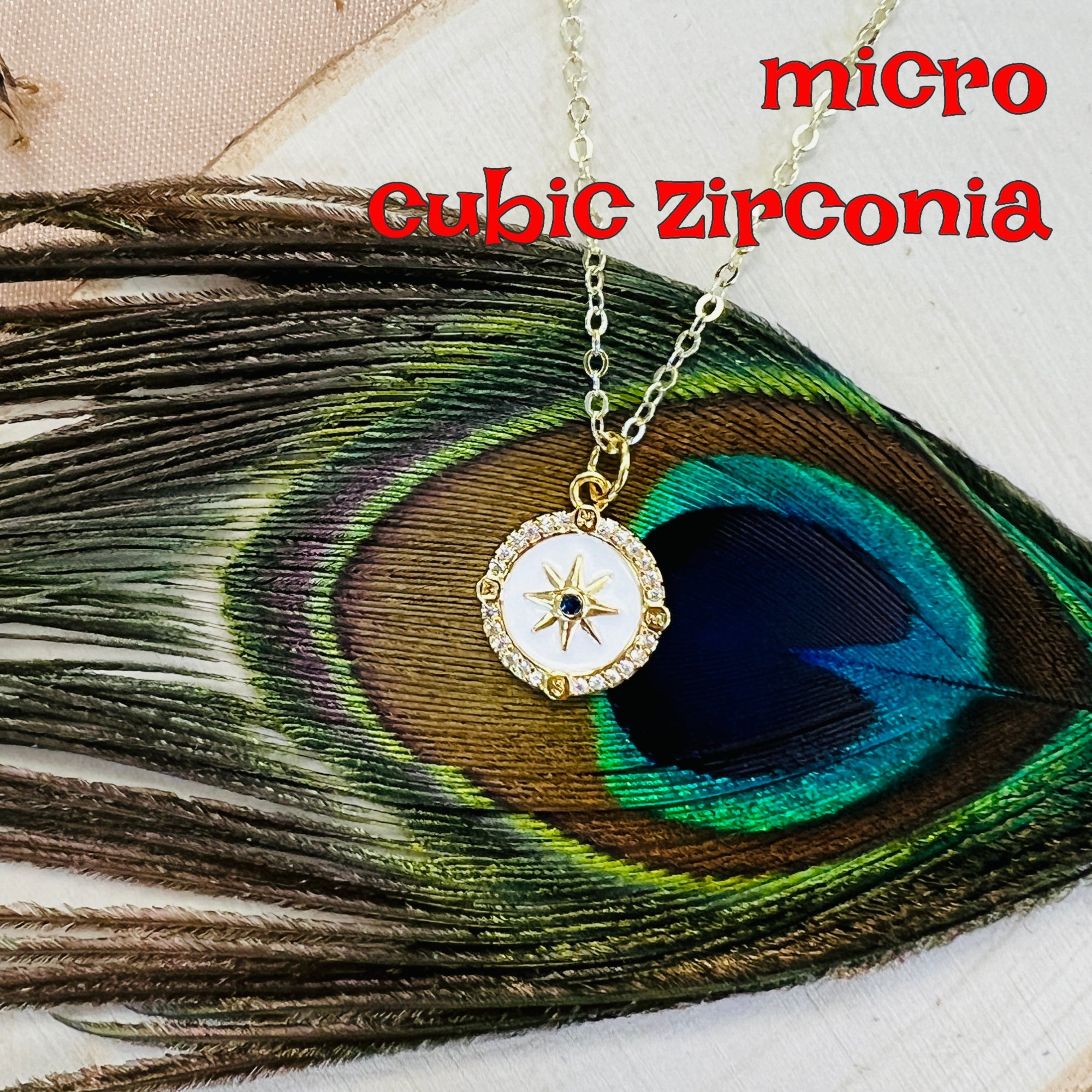 - Pendant: brass, real 18K Gold plated, long lasting plated, 1/2" in diameter, decorated with clear micro pave & Royal Blue Cubic Zirconia tiny stone over white enamel