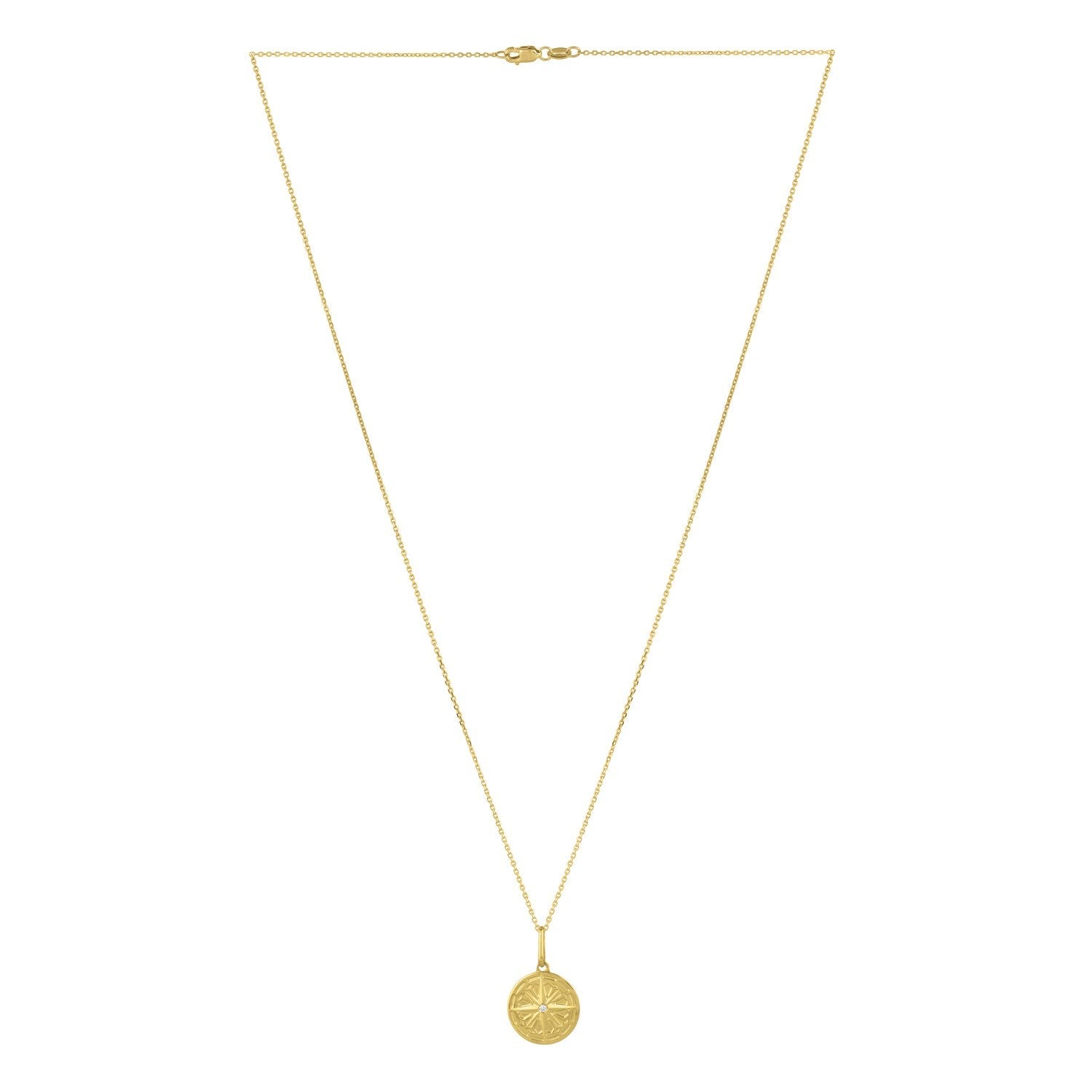 Guided by celestial brilliance, this 14k yellow gold round north star talisman pendant radiates with a sparkling point of light at its center. Encircled by delicate rays that extend outward, the design captures the allure of the night sky. This pendant, suspended on a delicate chain, is an enduring symbol of inspiration and hope. Secured with a lobster clasp closure.
