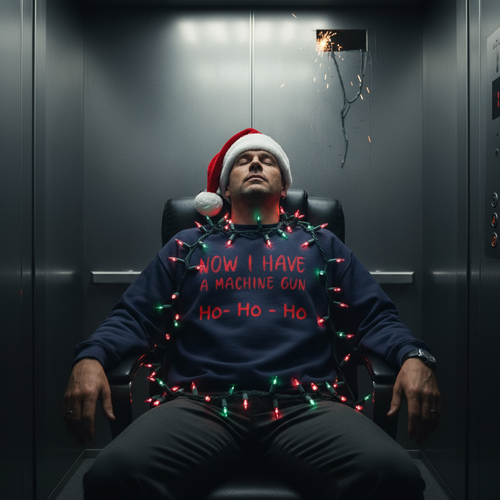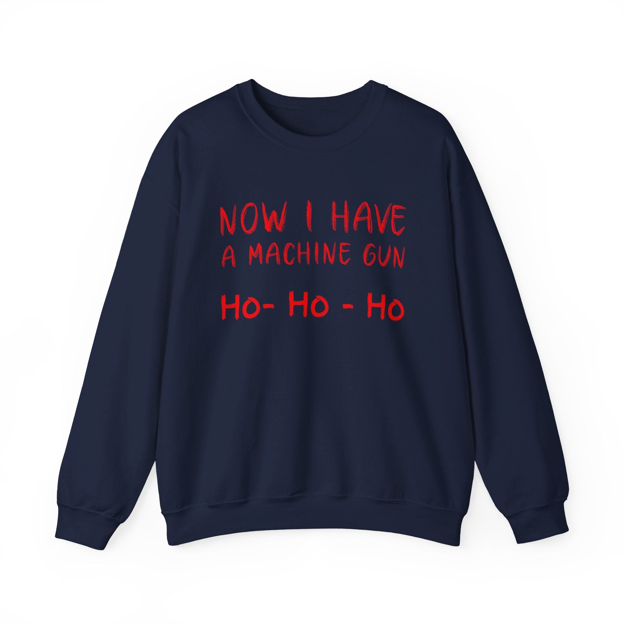 Sporting the cheeky message "Now I Have a Machine Gun Ho-Ho-Ho" in a particularly festive yet gritty "cranberry sauce" script, this pullover lets you jingle all the way... to an arsenal of fun! Constructed with the softest, non-itchy materials, it's perfect for sipping eggnog or crawling through ventilation systems.