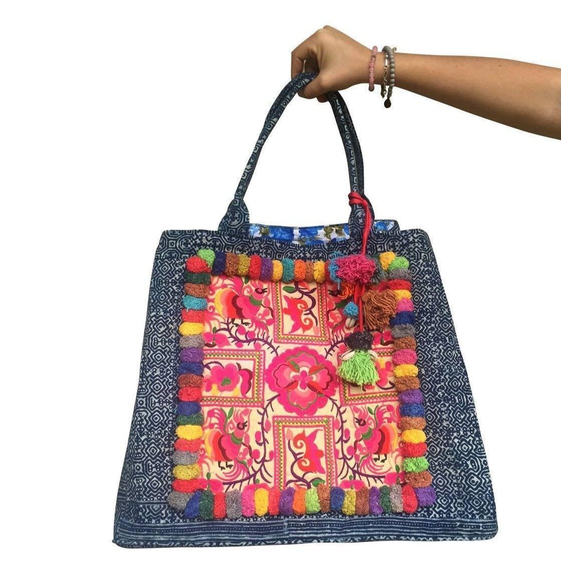 Oasis Hmong Batik PomPom Flower Beach Tote - Thailand