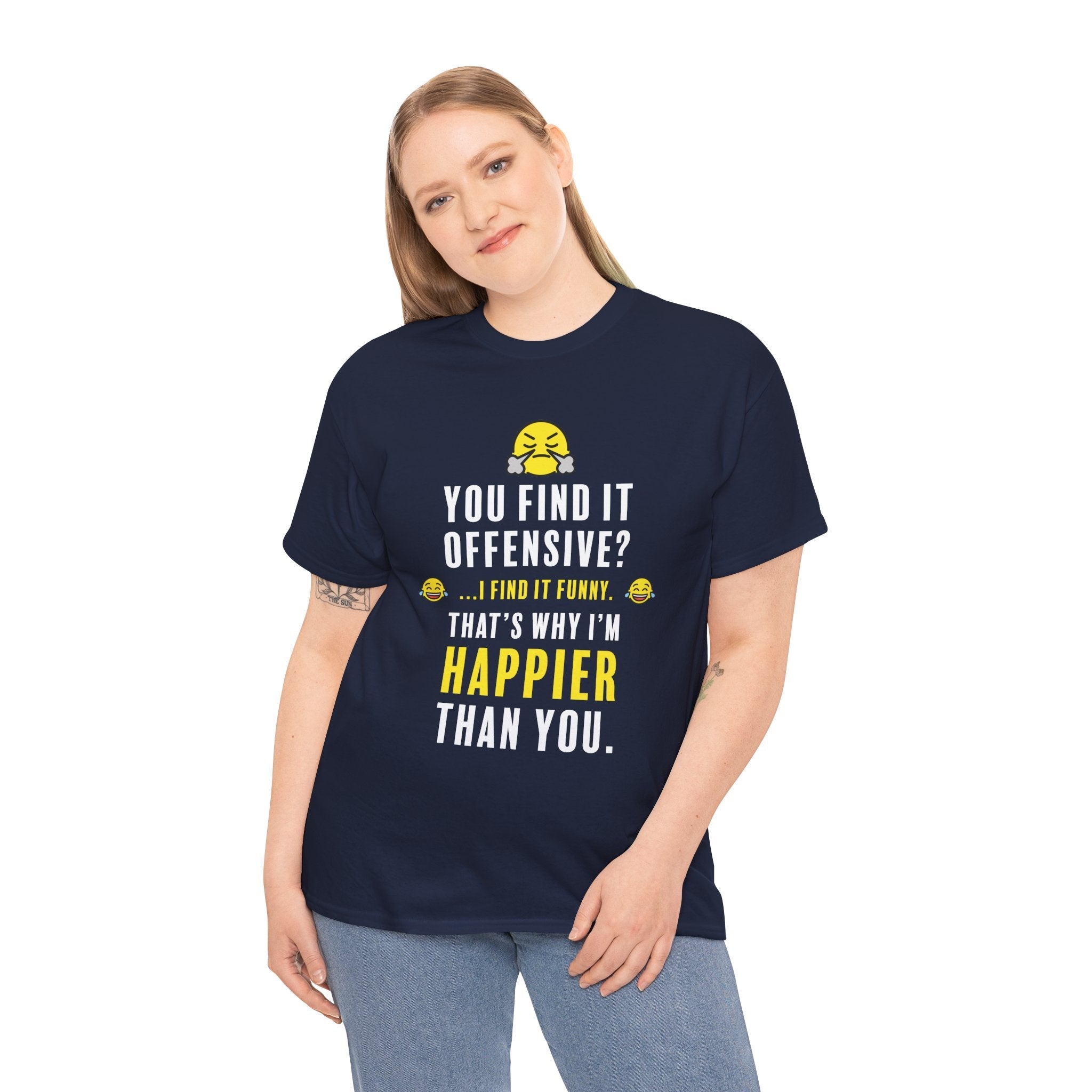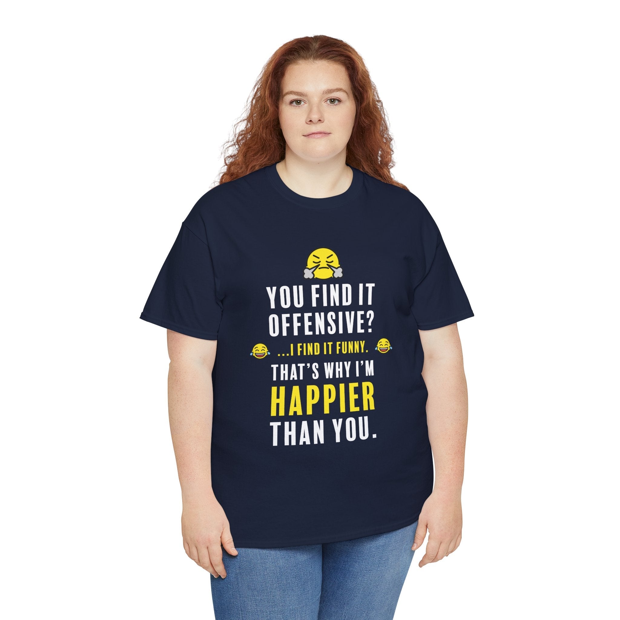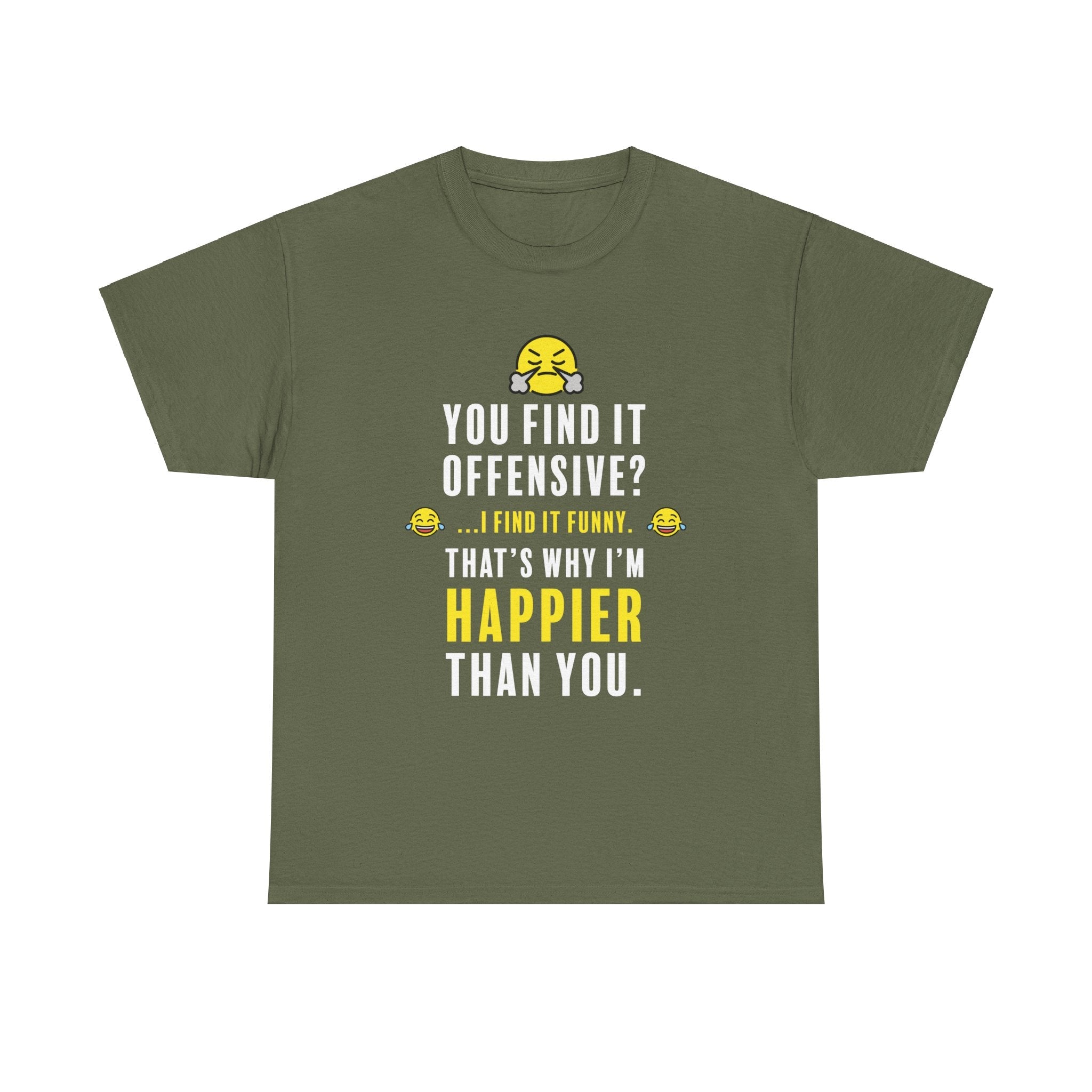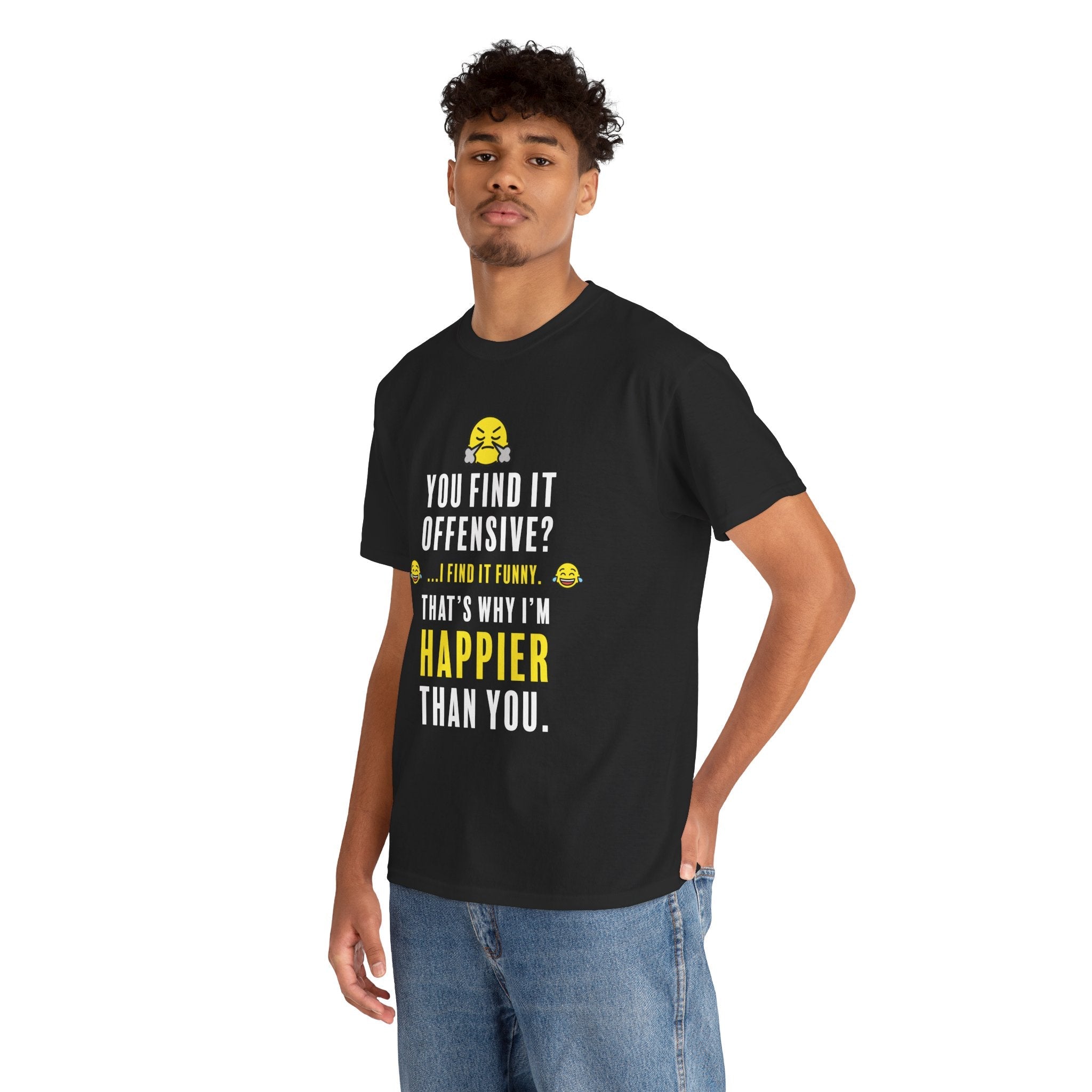 Unapologetically bold, our "Offensive? Funny. That's Why I'm Happier Than You" tee sparks conversations and challenges norms. Crafted with premium comfort, its message celebrates humor's power to bring joy amidst differences. Wear it proudly, provoke thought, and embrace the positivity of diverse perspectives. Be fearless, be happy.