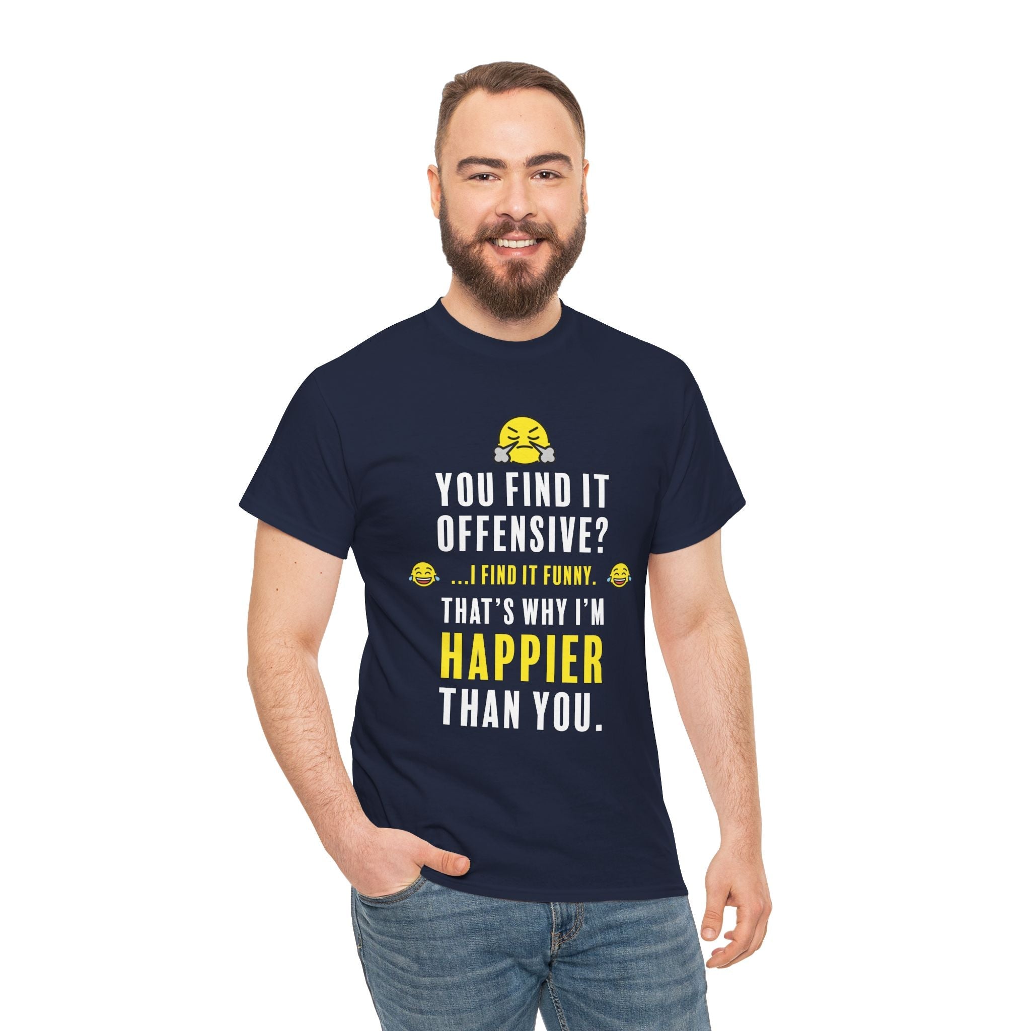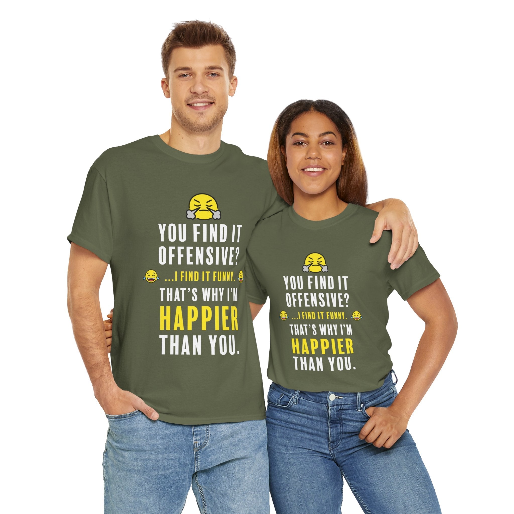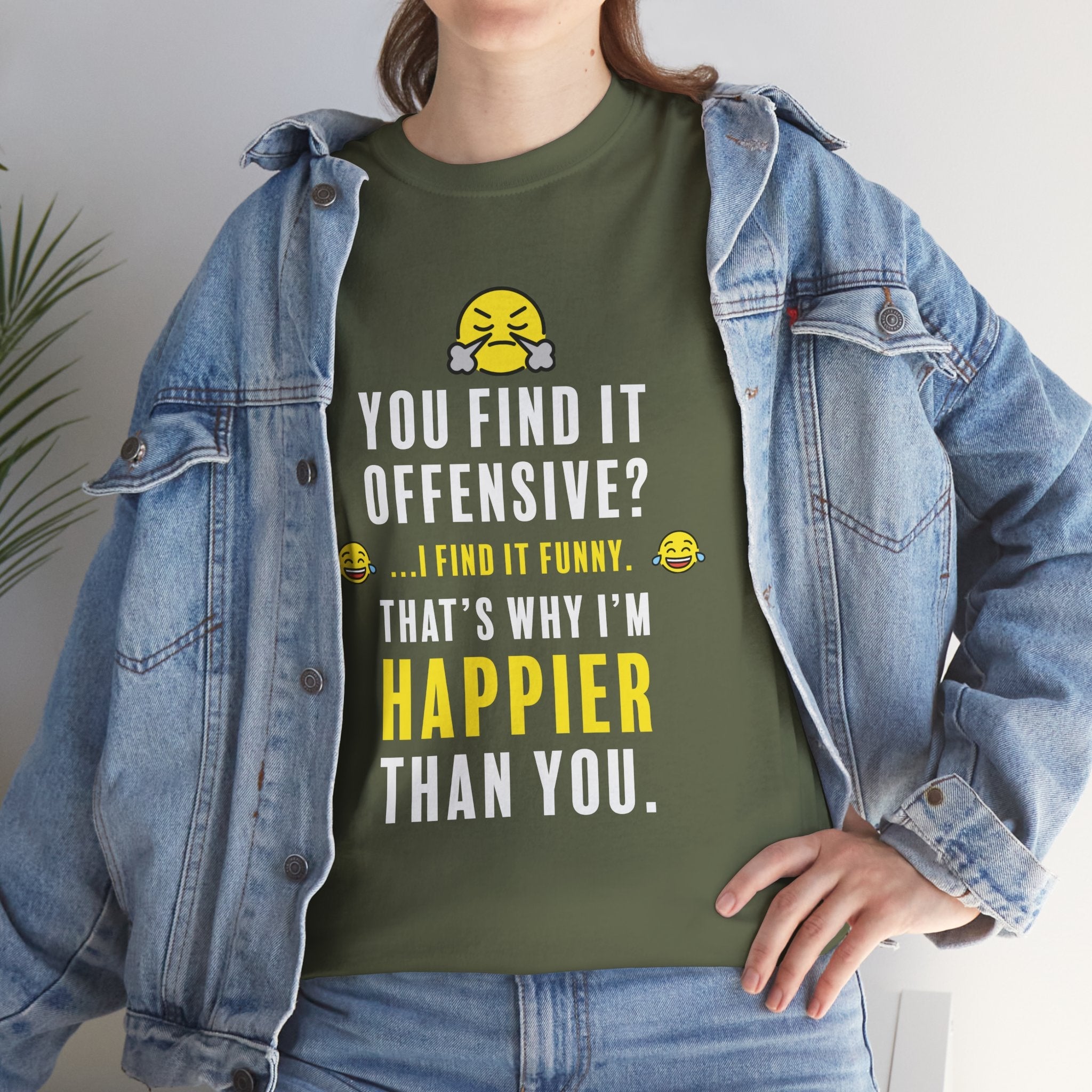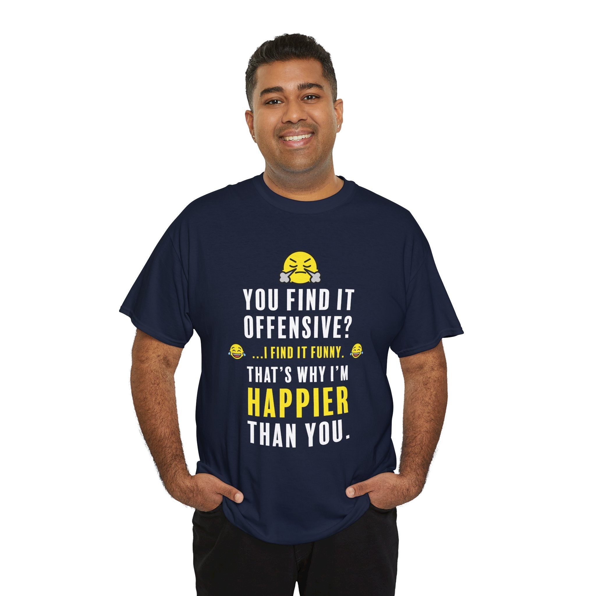 Unapologetically bold, our "Offensive? Funny. That's Why I'm Happier Than You" tee sparks conversations and challenges norms. Crafted with premium comfort, its message celebrates humor's power to bring joy amidst differences. Wear it proudly, provoke thought, and embrace the positivity of diverse perspectives. Be fearless, be happy.