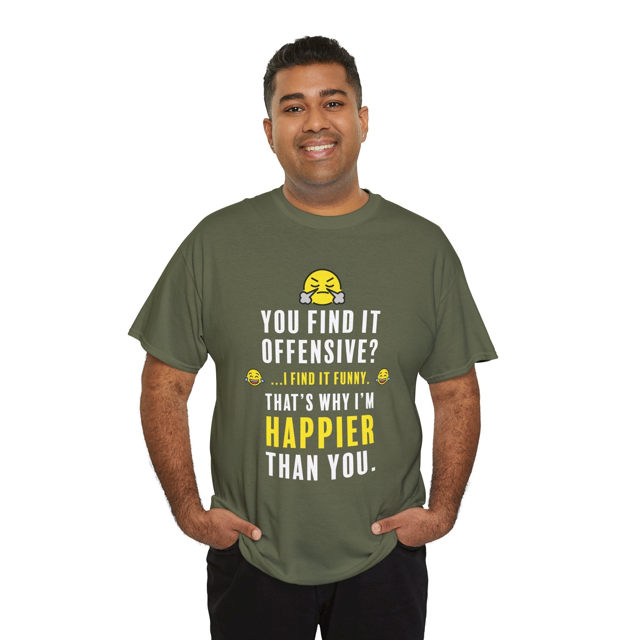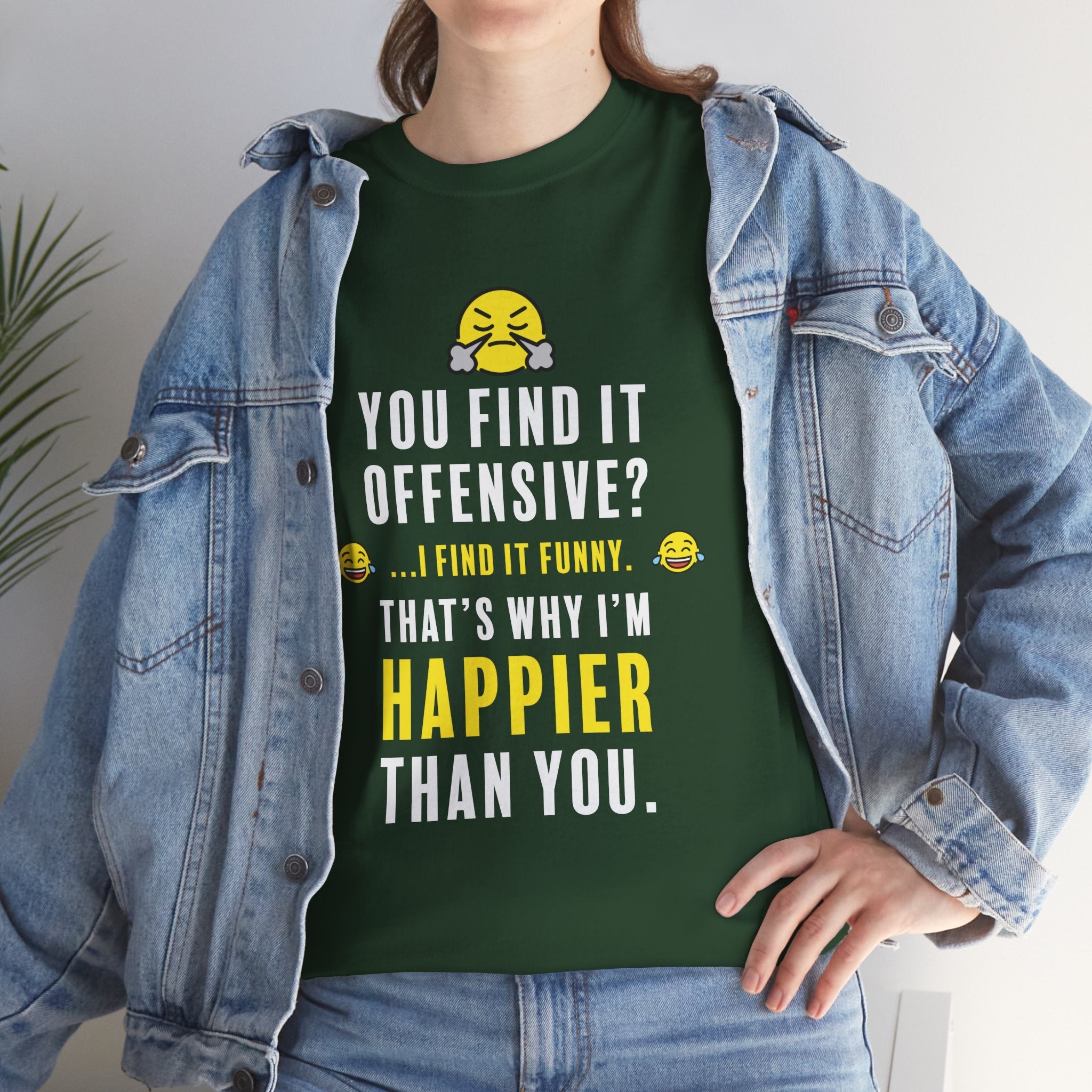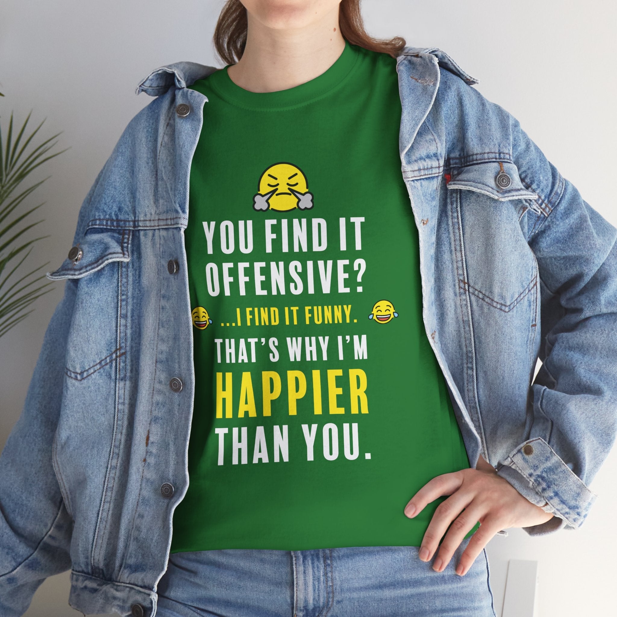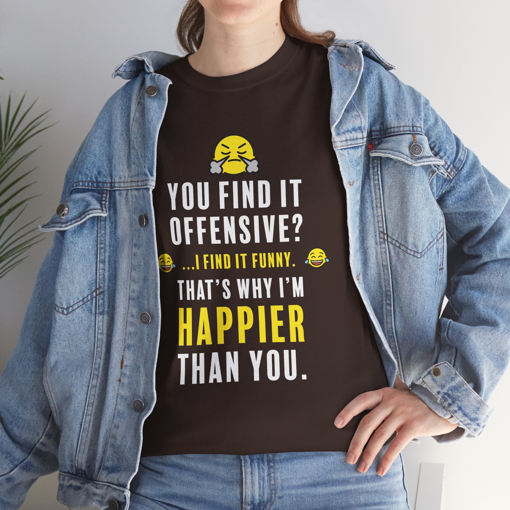 Unapologetically bold, our "Offensive? Funny. That's Why I'm Happier Than You" tee sparks conversations and challenges norms. Crafted with premium comfort, its message celebrates humor's power to bring joy amidst differences. Wear it proudly, provoke thought, and embrace the positivity of diverse perspectives. Be fearless, be happy.