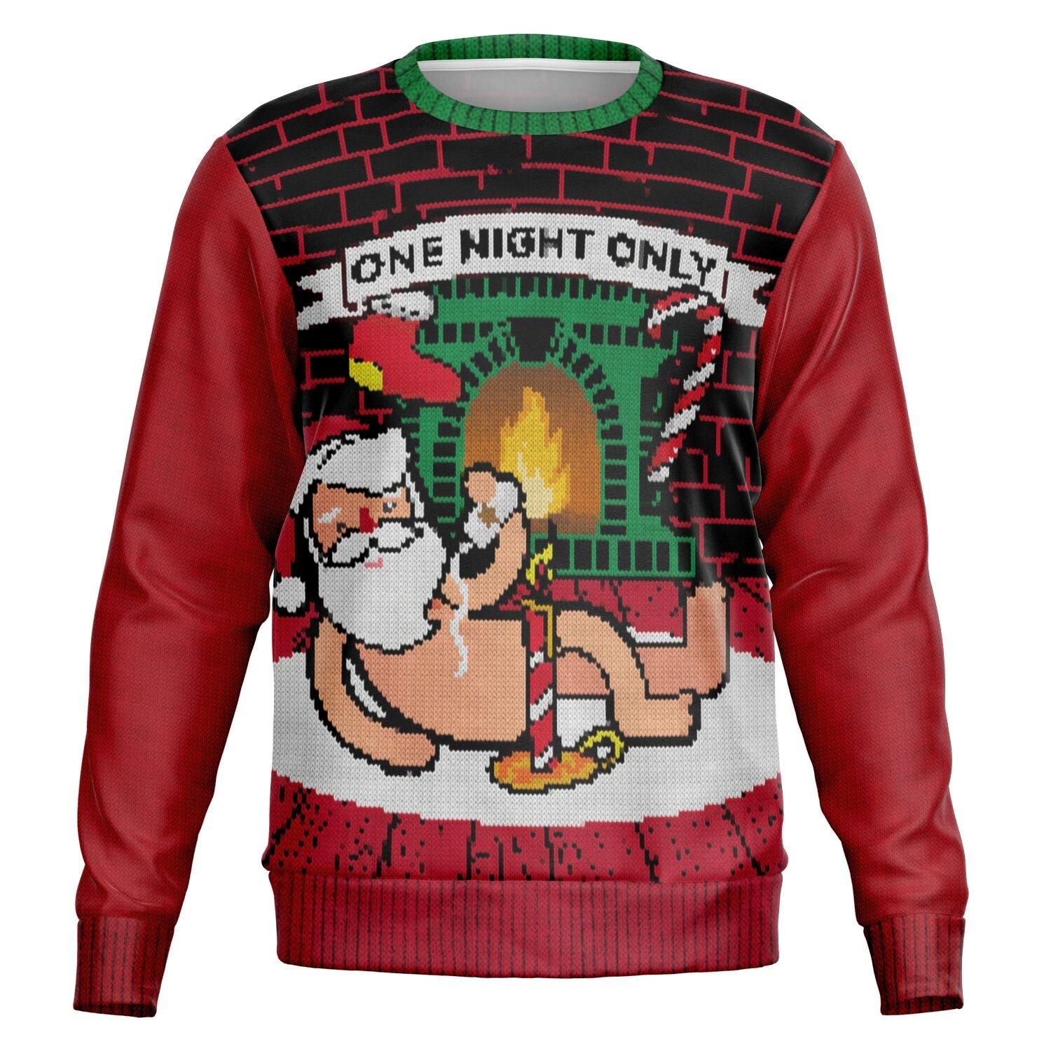 This wild Christmas sweater features a cheeky fireplace scene with Santa in all his glory, candle and all.