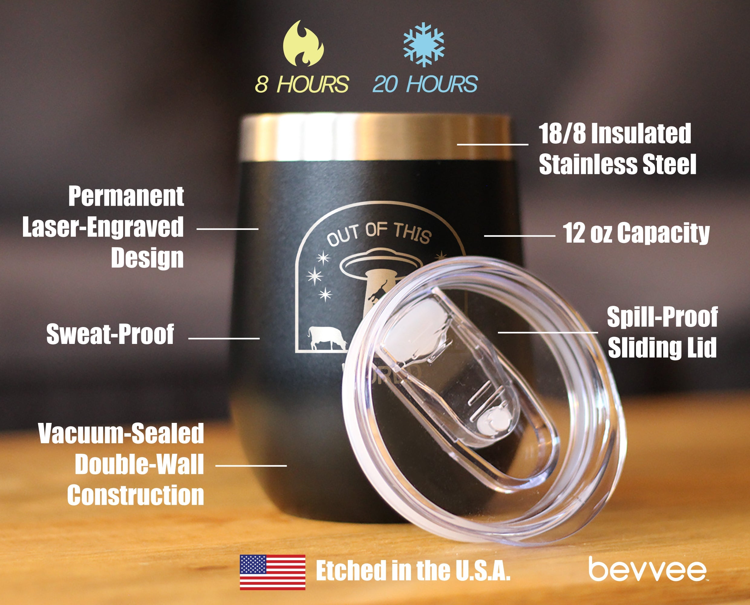 Our 12oz. stemless wine tumblers with sliding lids feature stainless steel double-wall construction, vacuum insulated for 2X cold and heat retention compared to glass or plastic containers! Etched in America.