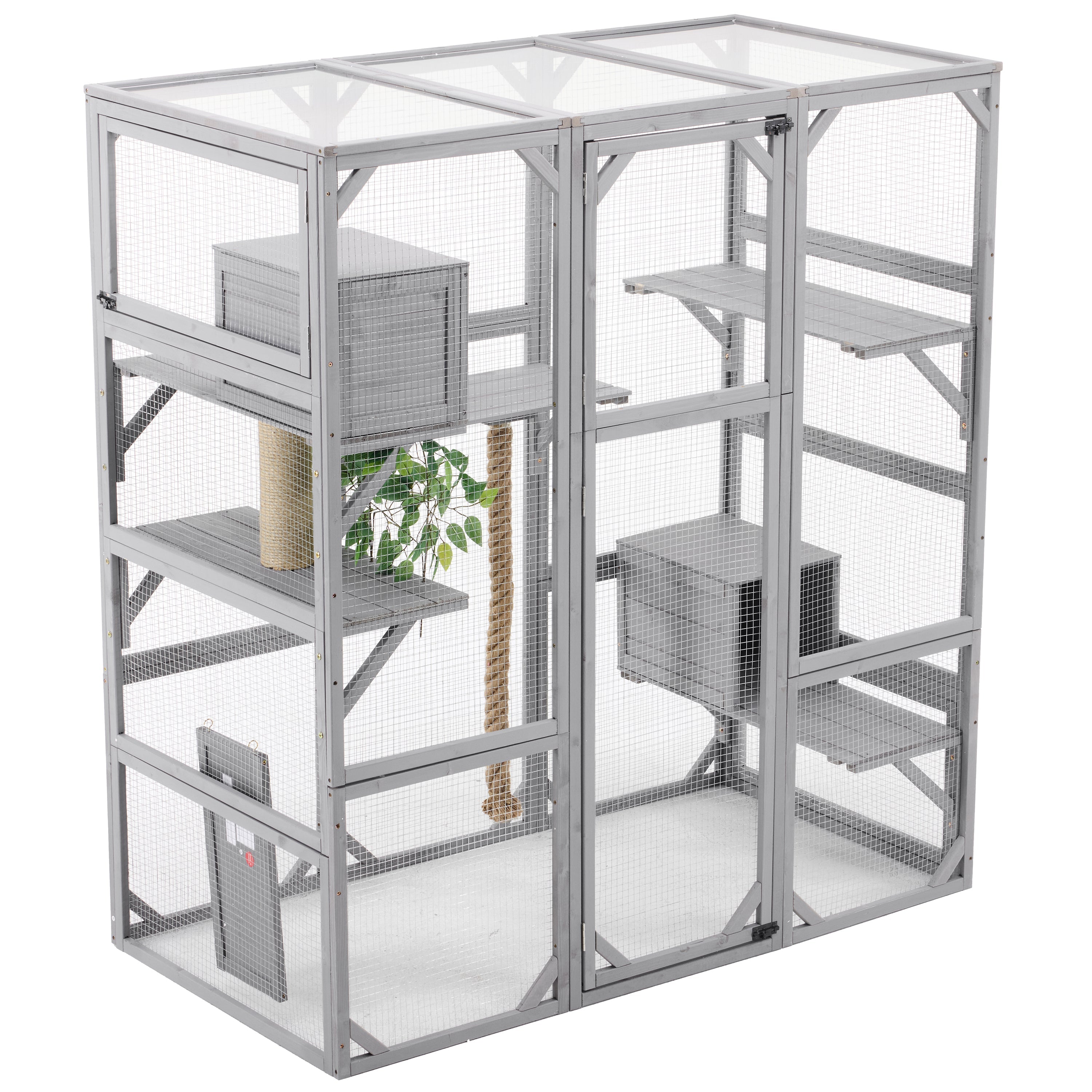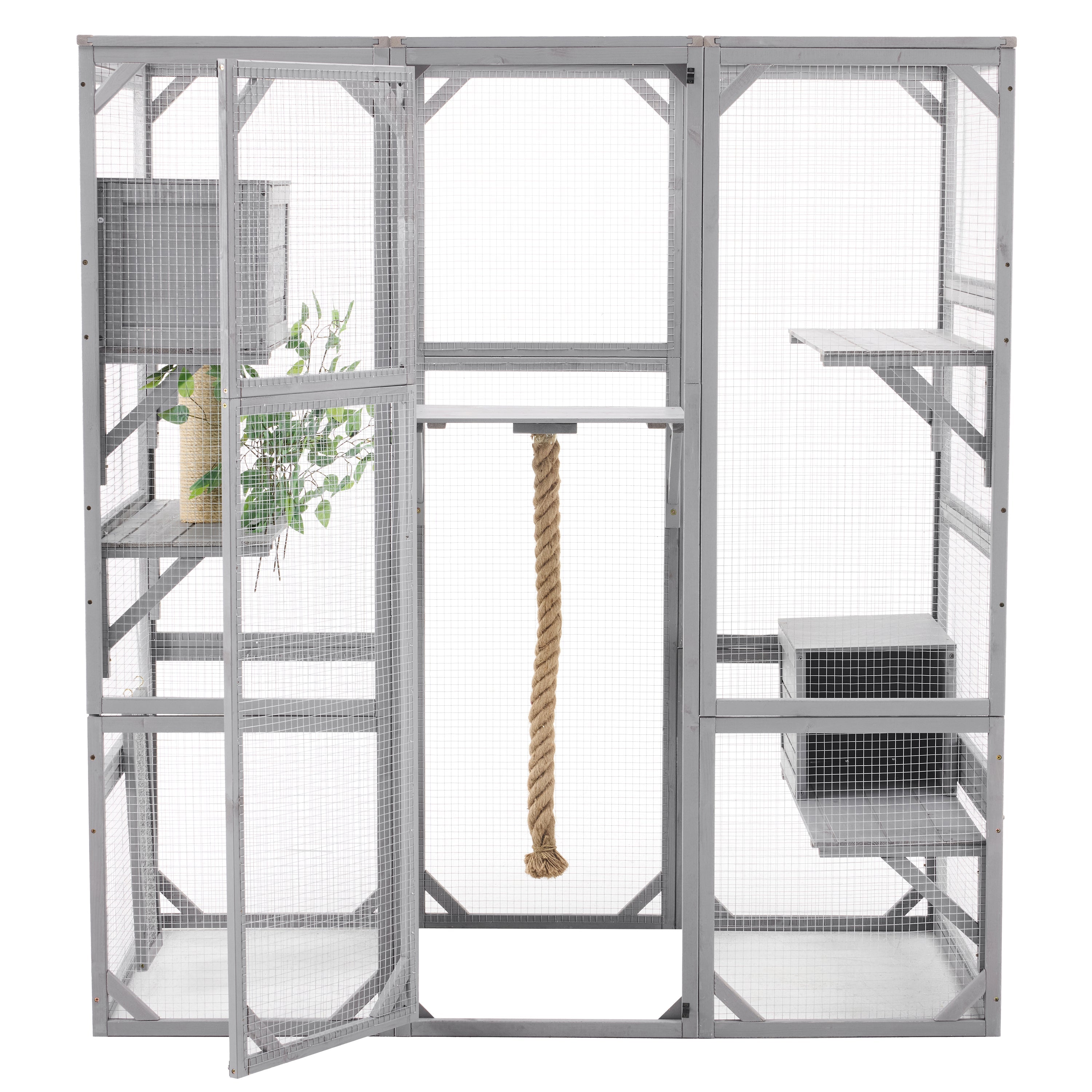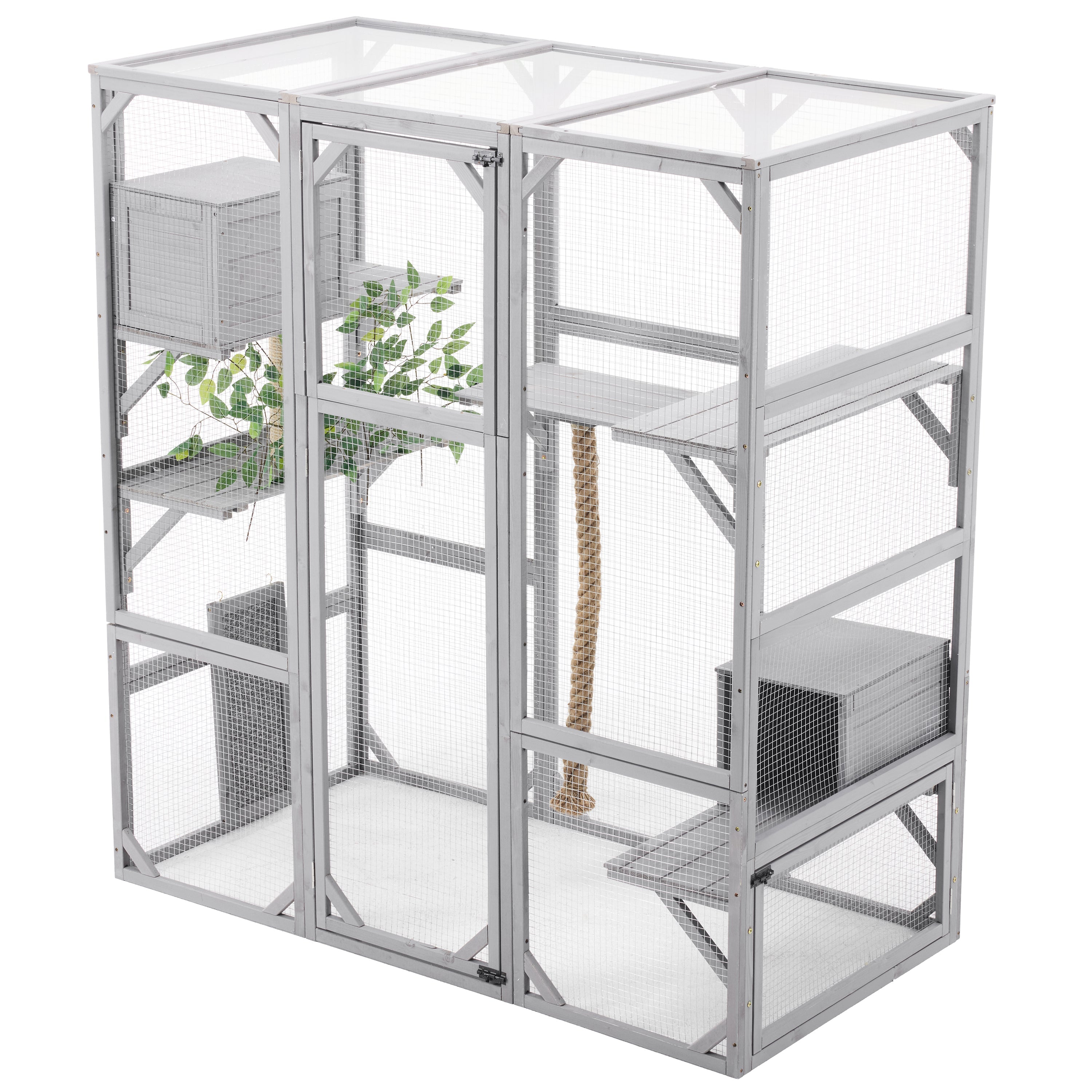 Outdoor Cat House, DIY Cat Enclosure Catio with Double Enter Doors, Light Grey Pine Wood, 62.8'L x 32.2'W x 68.5'H ‐ Default