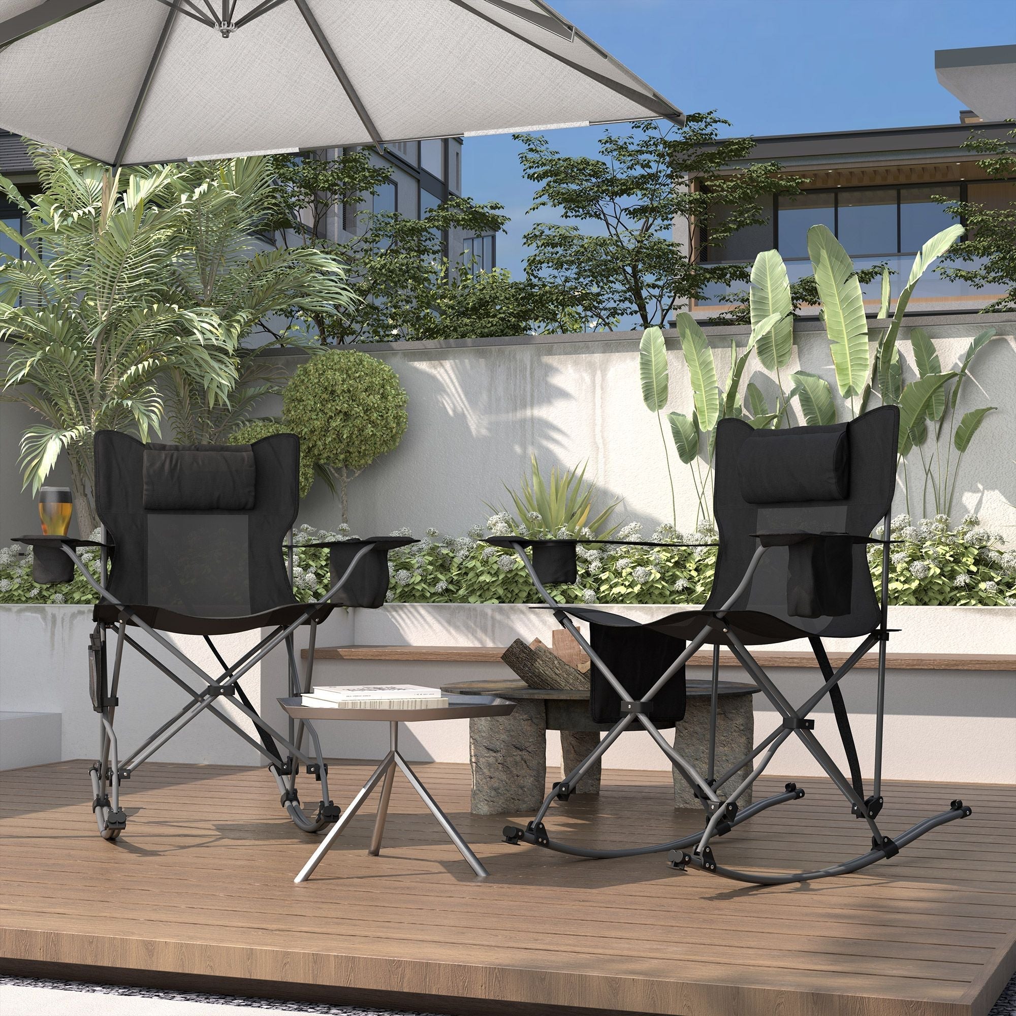 Outsunny Portable Outdoor Folding Rocking Camping Chairs with Headrest, Cooler Bag, Cup Holder, Carry Bag, 2 Pack, Black