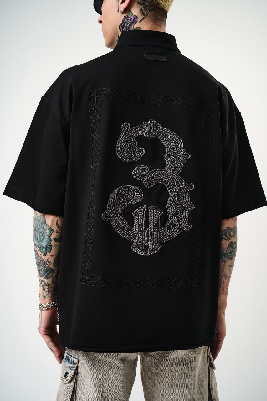 Oversize Cotton Tee - Half-Zip High Neck Chain Graphic Shirt ‐ Black / L