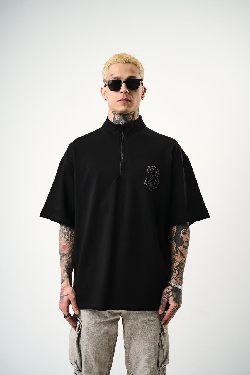 Oversize Cotton Tee - Half-Zip High Neck Chain Graphic Shirt ‐ Black / XL