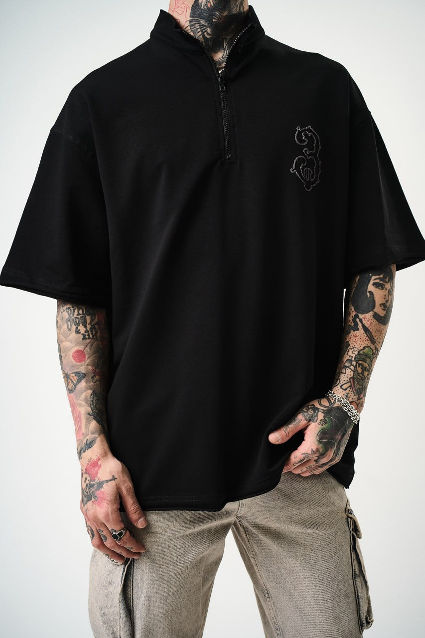 Oversize Cotton Tee - Half-Zip High Neck Chain Graphic Shirt ‐ Black / S