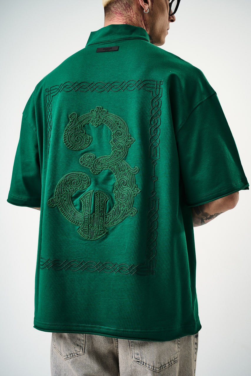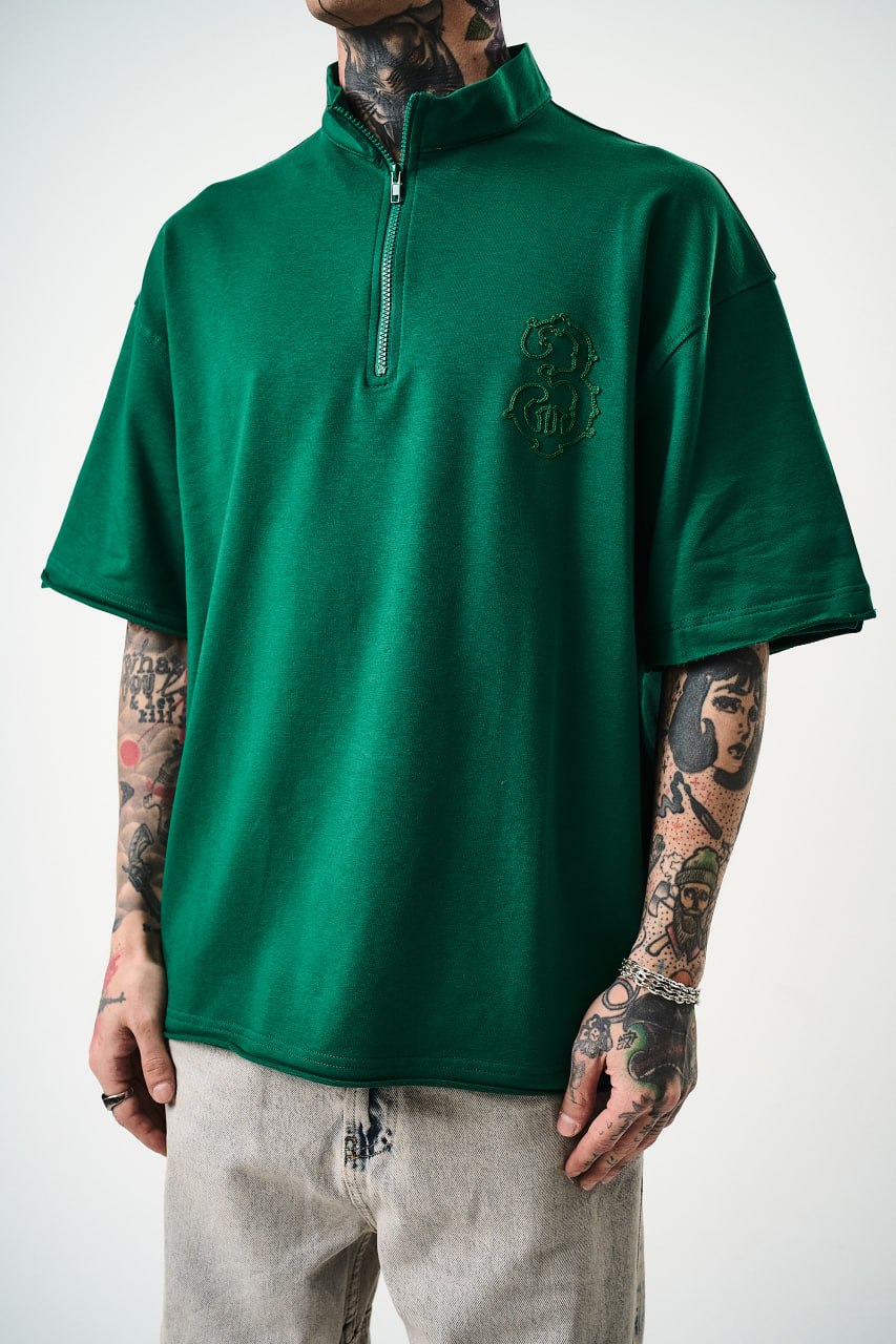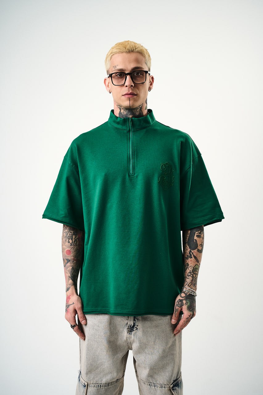 Oversize Cotton Tee - Half-Zip High Neck Chain Graphic Shirt ‐ Green / XL
