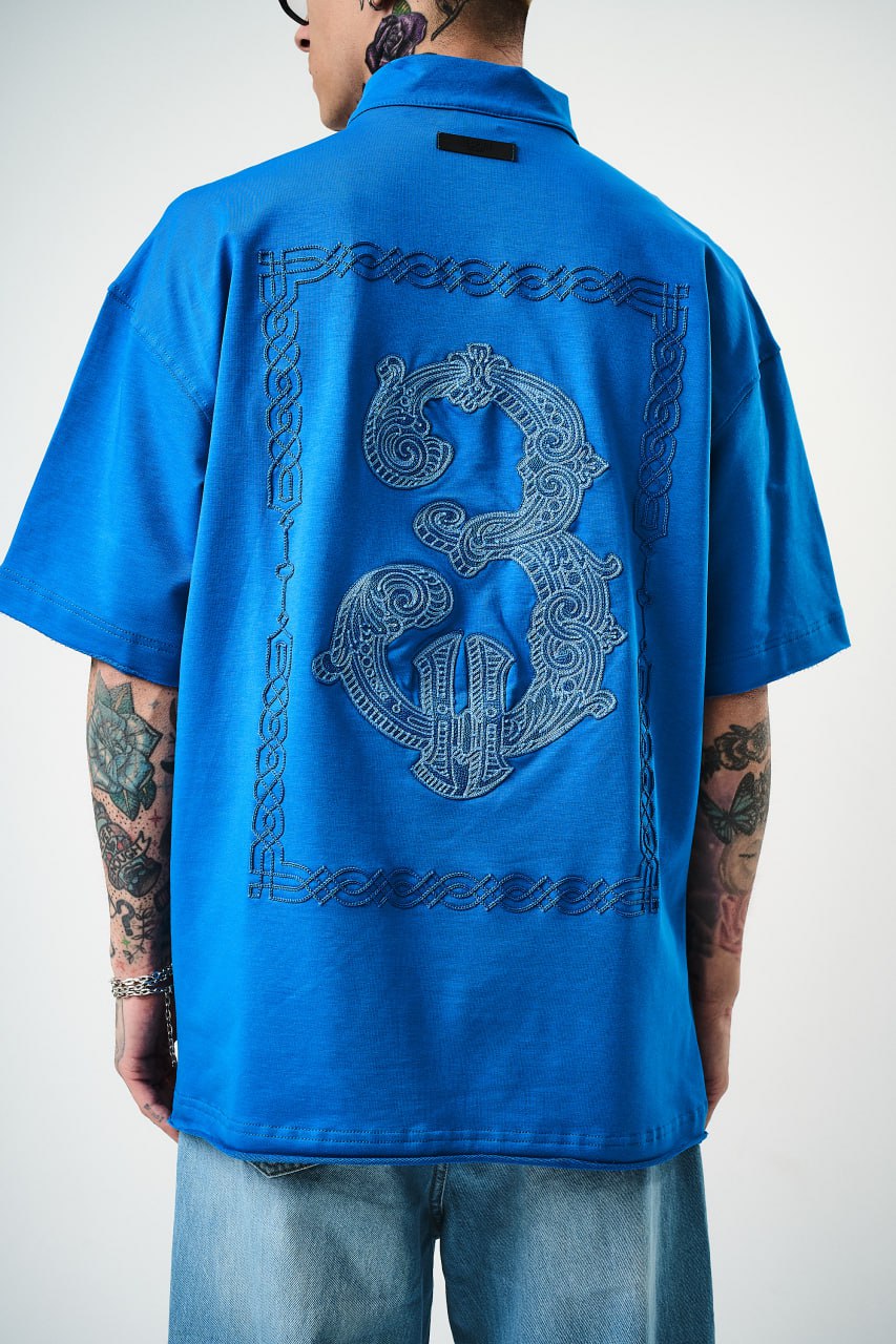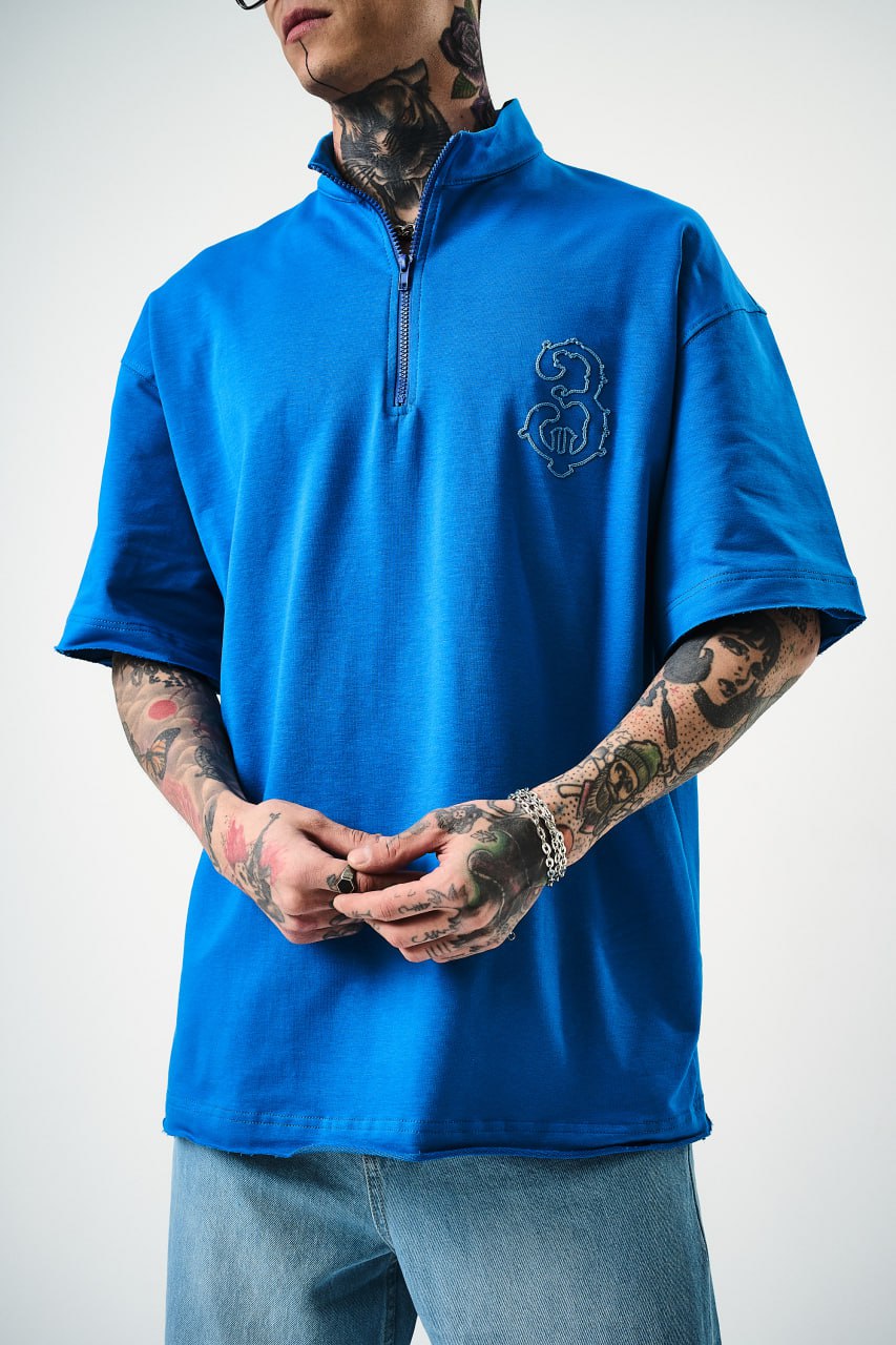 Oversize Cotton Tee - Half-Zip High Neck Chain Graphic Shirt ‐ Blue / XL
