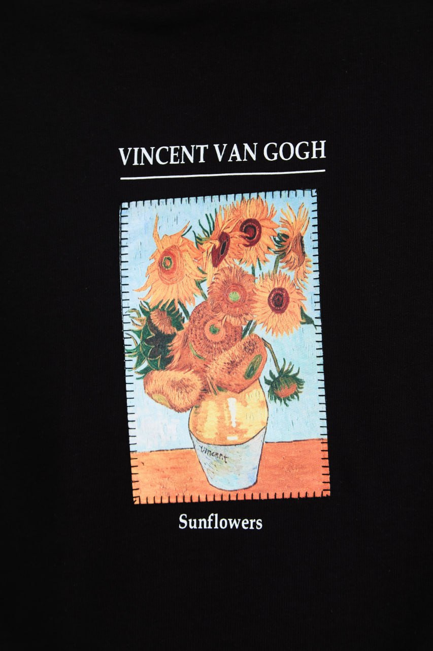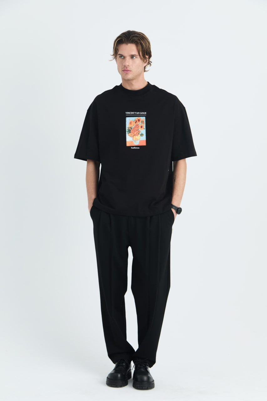 Oversize Cotton Tee - Van Gogh Sunflowers Art Print with Quote ‐ Black / XL