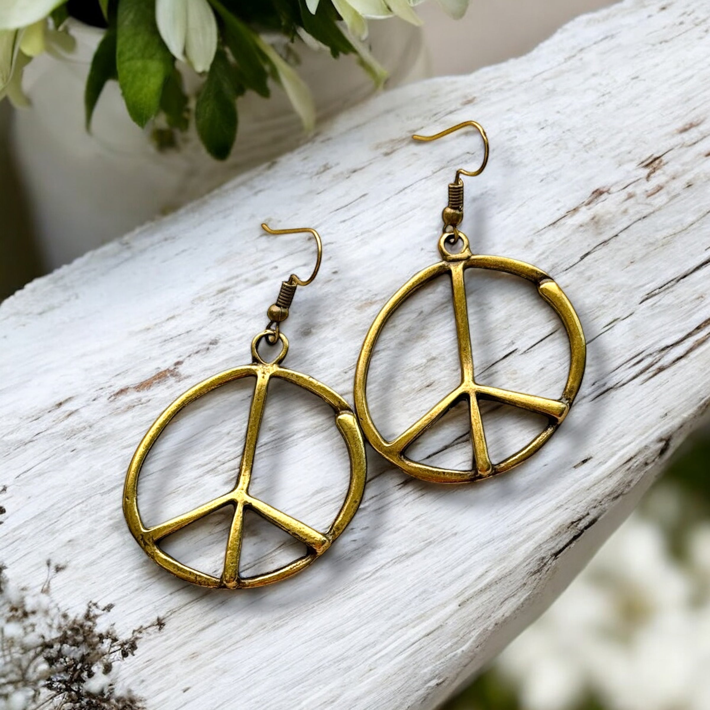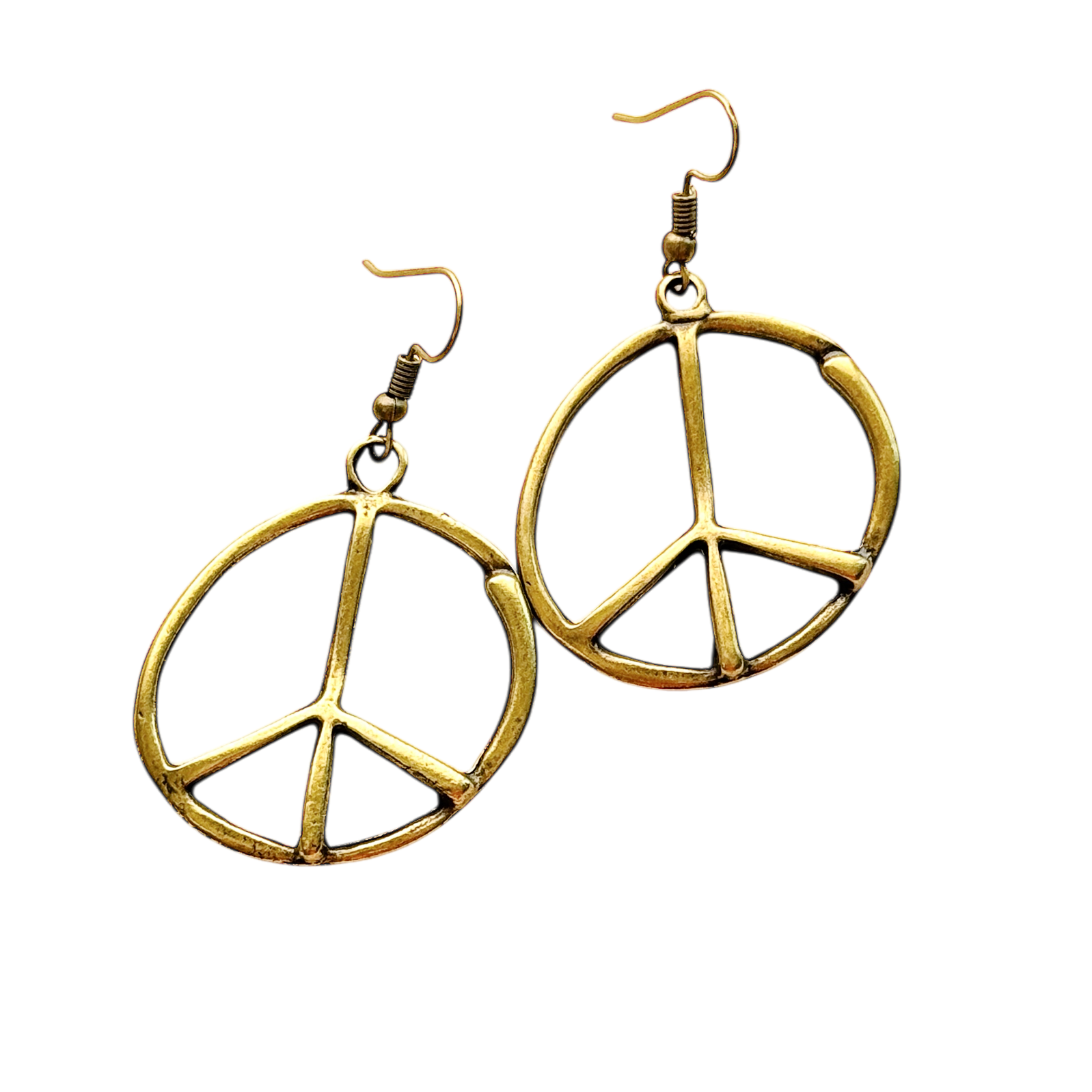 -Earrings; silver or bronze tone, about 1-1/4" in diameter on ear wires, featuring peace sign symbol
