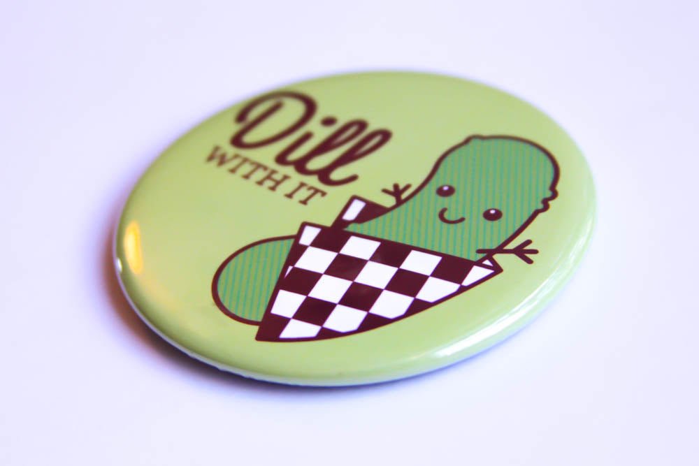 These dill pickle buttons make awesome stocking stuffers, gifts, or party favors. Design features a happy pickle and the words "Dill With It!"