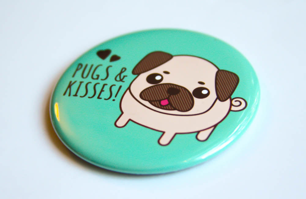 These buttons make awesome stocking stuffers, gifts, or party favors. Design features an adorable pug dog and the words "pugs & kisses!"