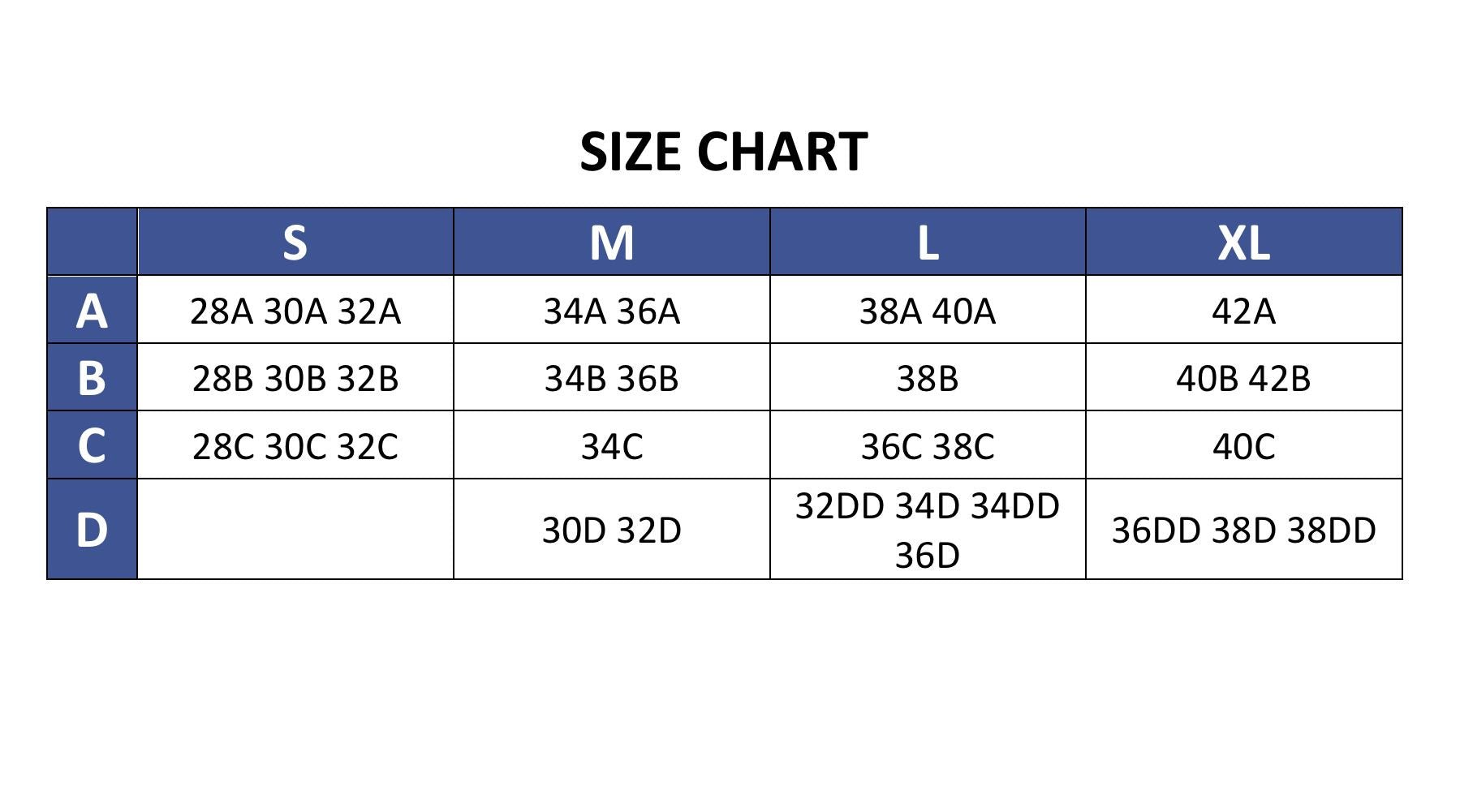 | D | 30D 32D | 32DD 34D 34DD 36D | 36DD 38D 38DD |