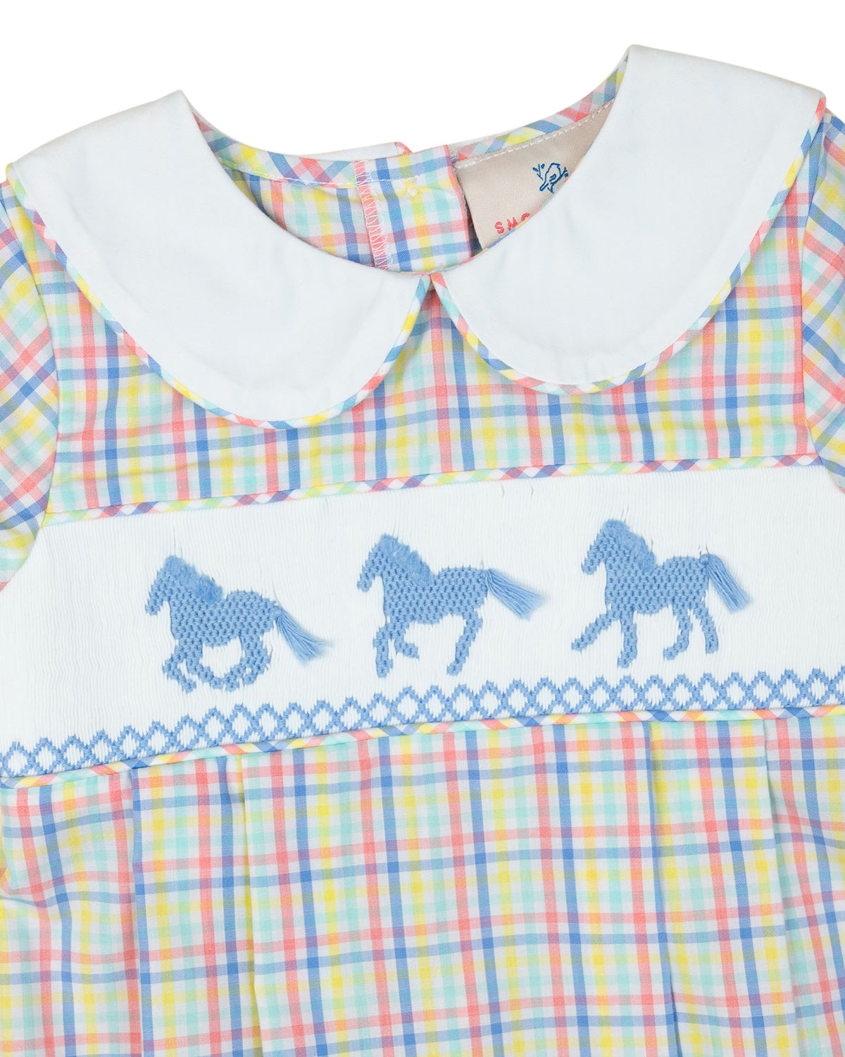 Keep it classic with our Ready to Run Smocked Boy Bubble, featuring a tailored design and a charming horse-themed smocked panel. The pastel plaid fabric pairs beautifully with a crisp Peter Pan collar and snap closures for easy dressing. A perfect match with the Ready to Run Smocked Dress, this piece is ideal for coordinating sibling outfits and photo-worthy moments.