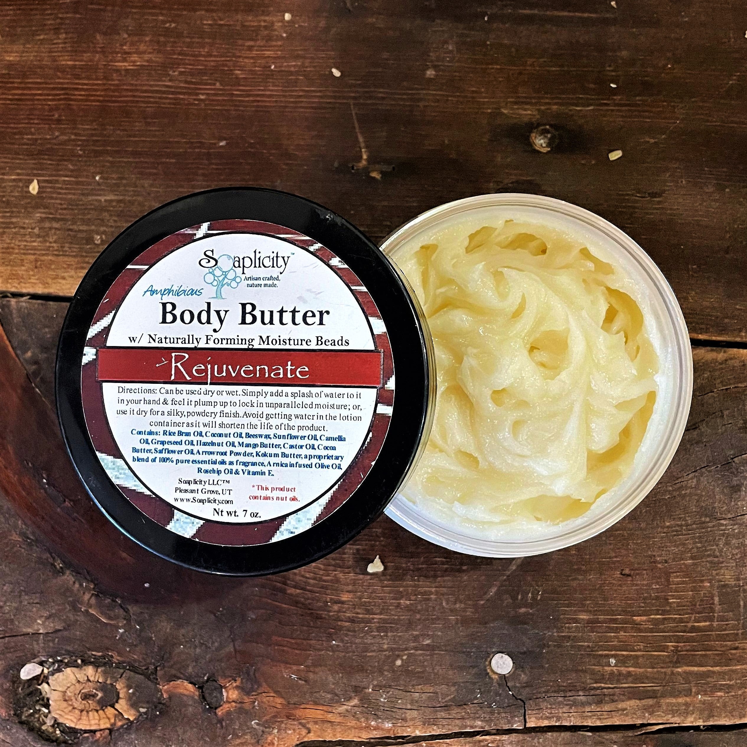 Like all of our body butters, Rejuvenate is ingeniously formulated as a concentrate to be used right out of the shower or tub while you are still dewy to deeply penetrate the dermal layers and hydrate all day long. It is 100% natural and made with only the finest, sustainable oils and butters. Naturally forming moisture beads develop over time that subdue itchy skin, then melt to lock in moisture. Absolutely decadent!