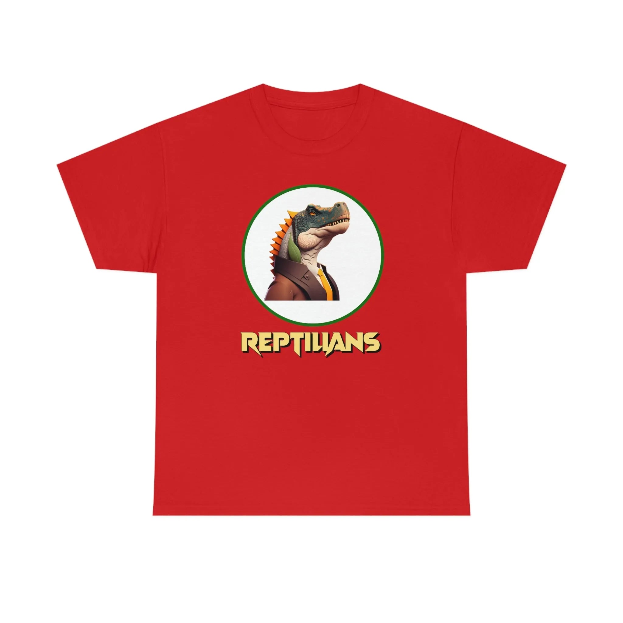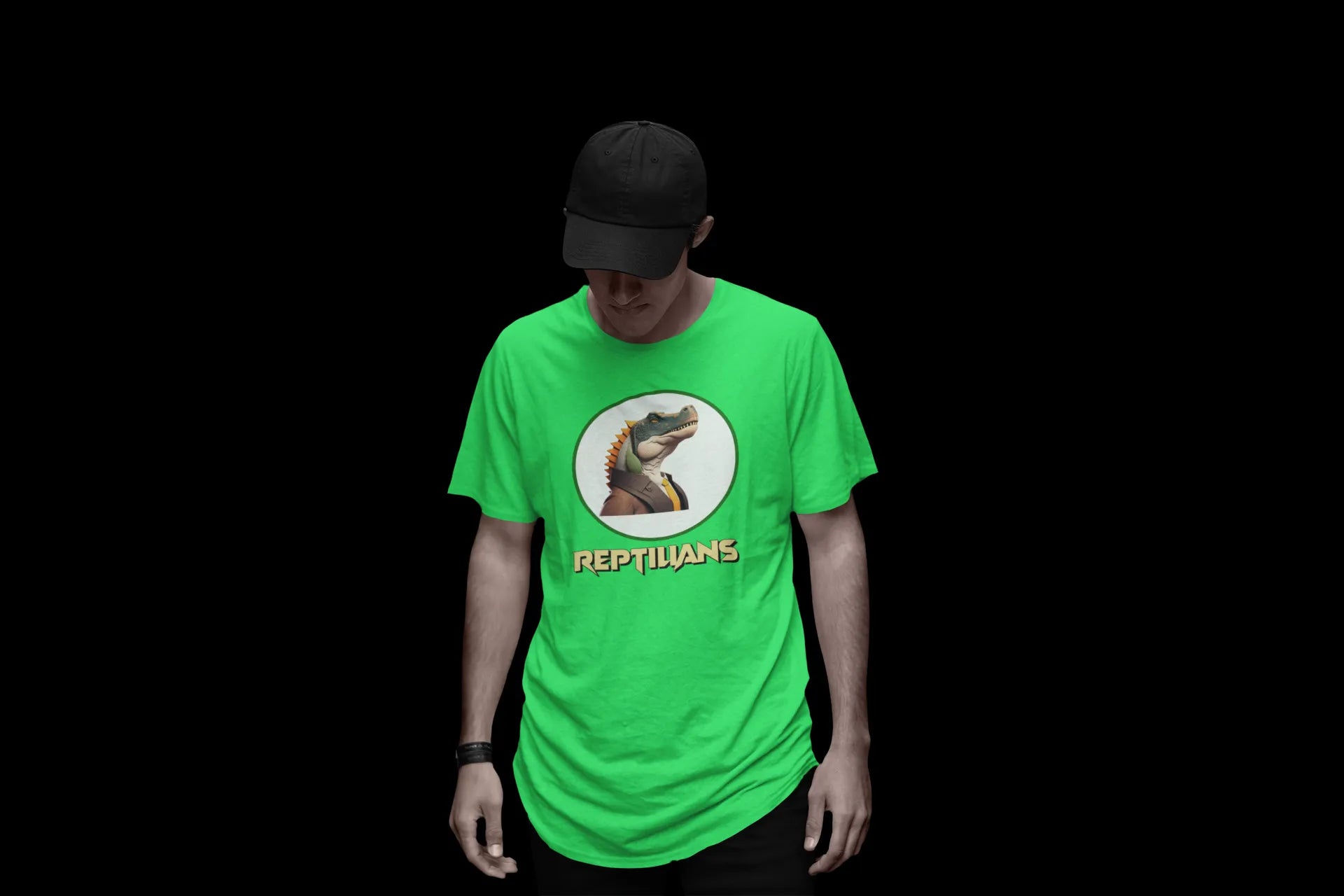 On the front, you'll find a distinguished lizard overlord proudly displaying his scaly physique in a team jersey. And let's face it, he's the captain of the team - no one messes with this guy. The shirt boldly declares "Reptilians" across the chest, so everyone knows whose side you're on.