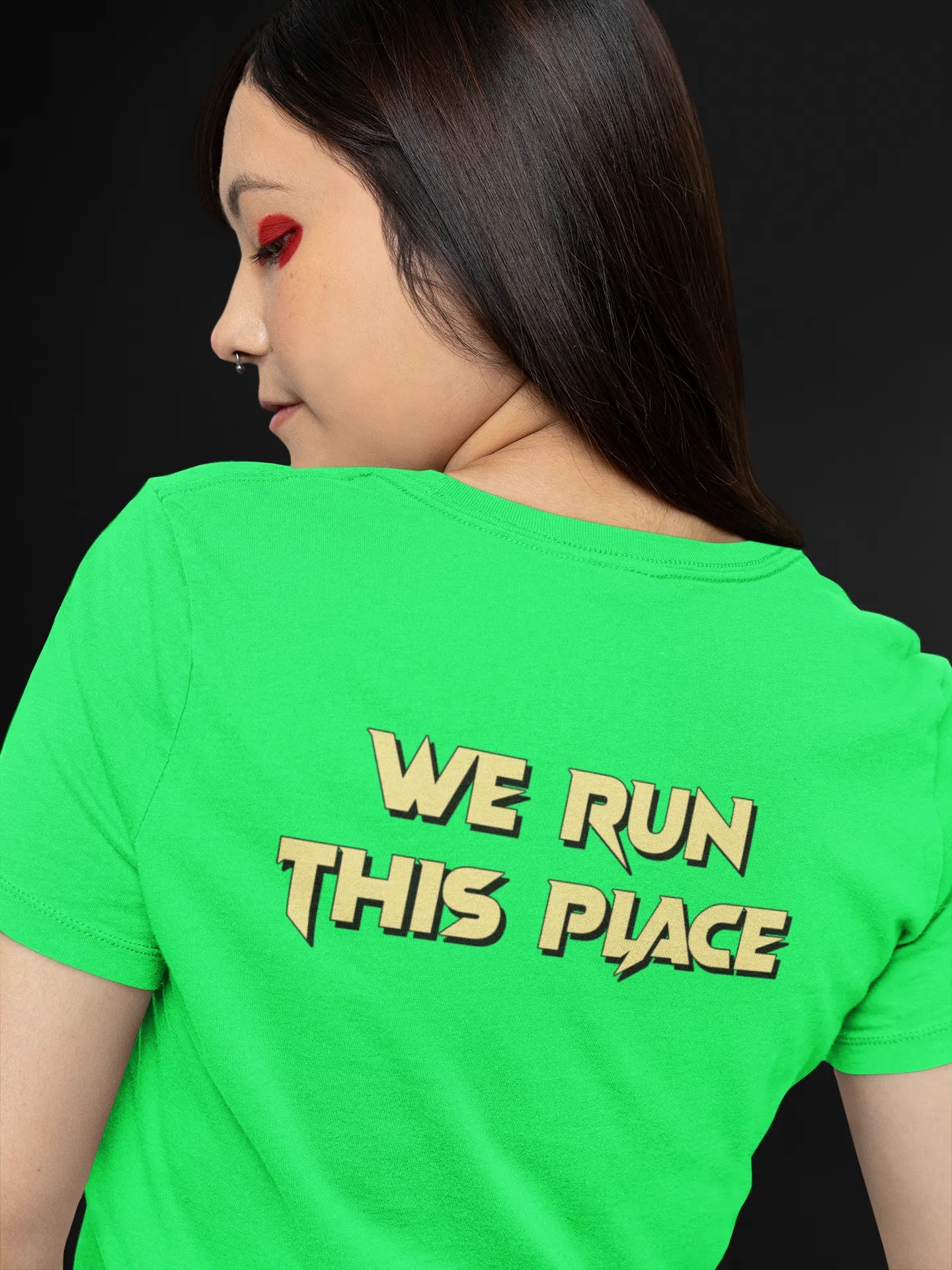 But the real humor comes from the back of the shirt. Emblazoned with the words "We run this place," you'll instantly be transformed into a member of the elite reptilian ruling class. Imagine the looks on people's faces as you strut down the street in your new tee, declaring your allegiance to the scaly overlords. Who knows, maybe you'll even inspire a few conspiracy theorists to start looking at you with newfound suspicion.