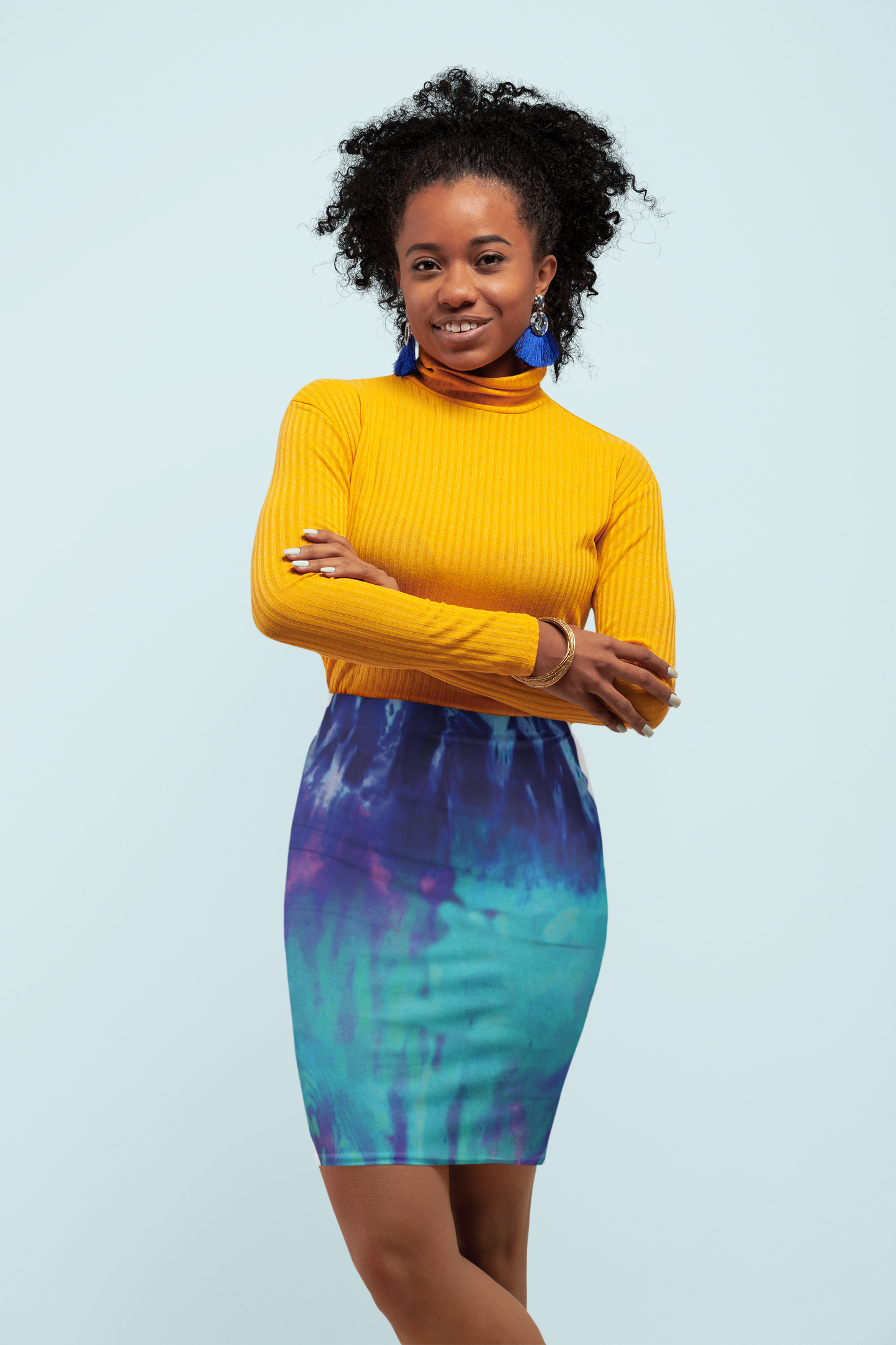 An amethyst & cobalt hand-dyed print cut and sewn pencil skirt is a must-have. It is made of 88% 4-Way Stretch Modal poly and 12% performance spandex. The styling has a slight tapering along the outer thigh to provide that signature look. Ancient Nazca lines for attracting that good energy.
