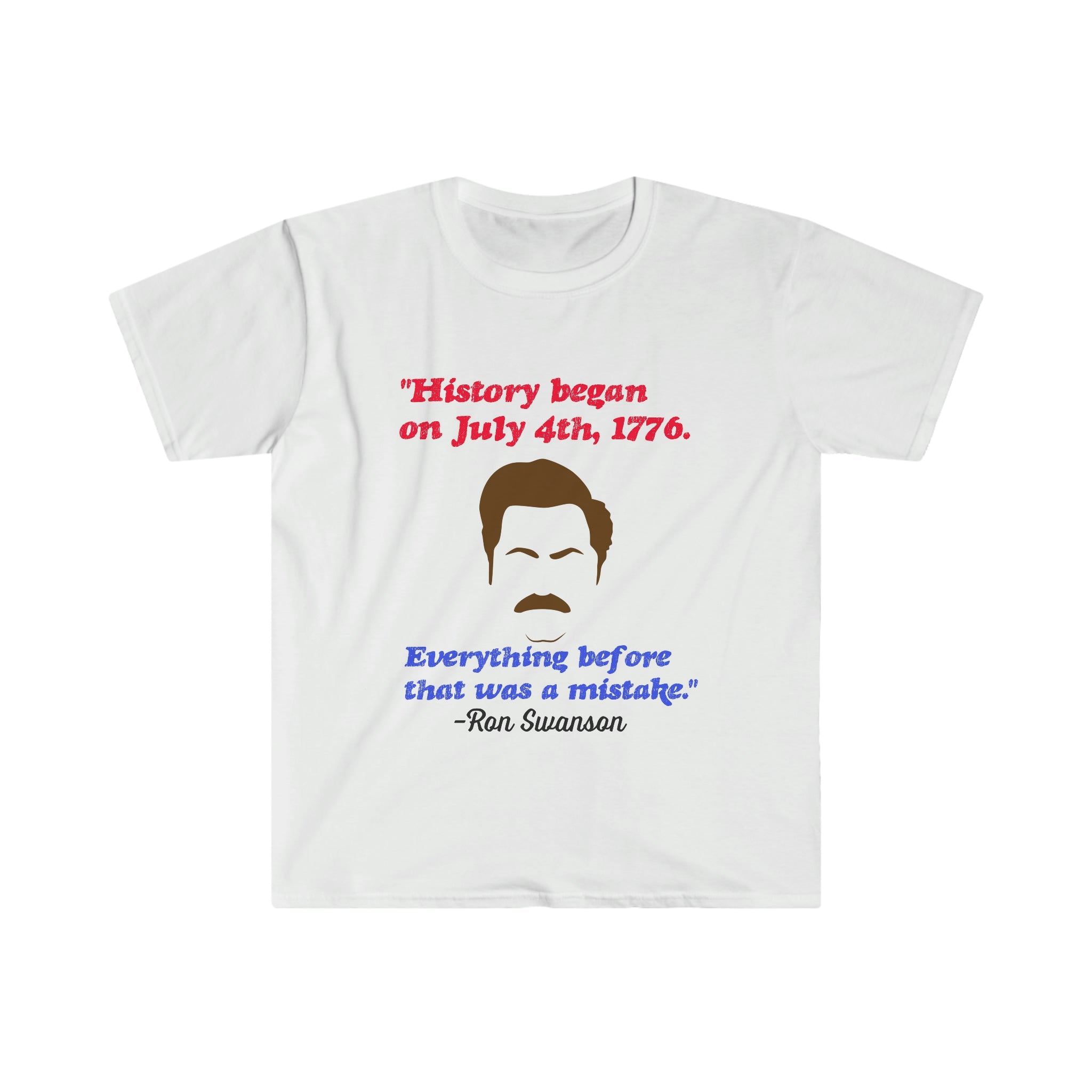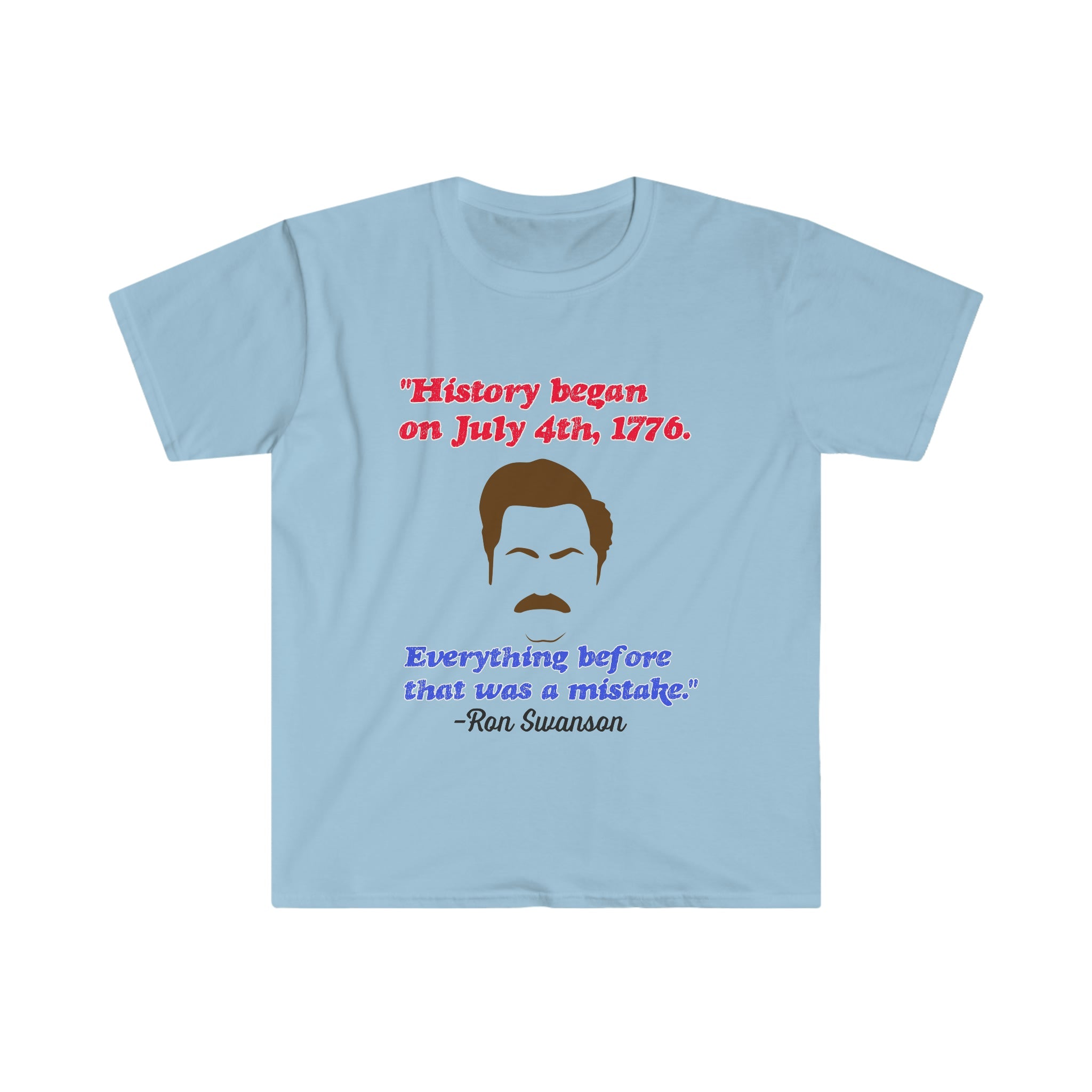 Introducing our latest addition to the Liberty Collection - the Ron Swanson "History Began" tee! This shirt features a hilarious representation of the mustachioed man himself, accompanied by his iconic quote, "History began on July 4th, 1776. Everything before that was a mistake."