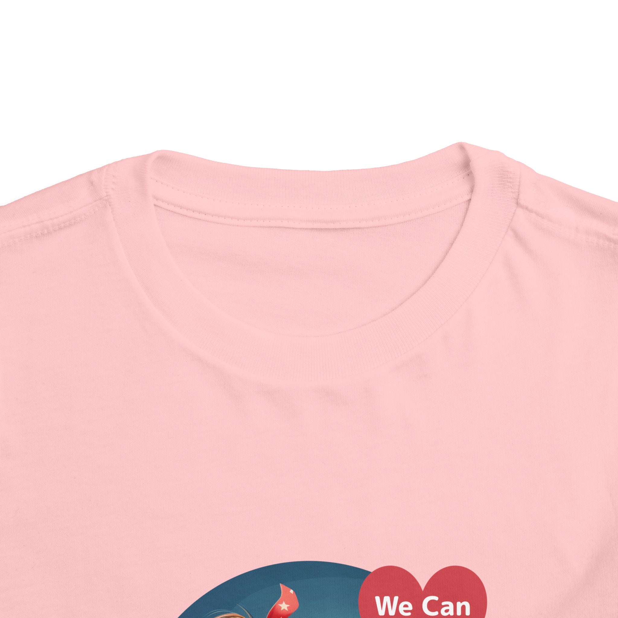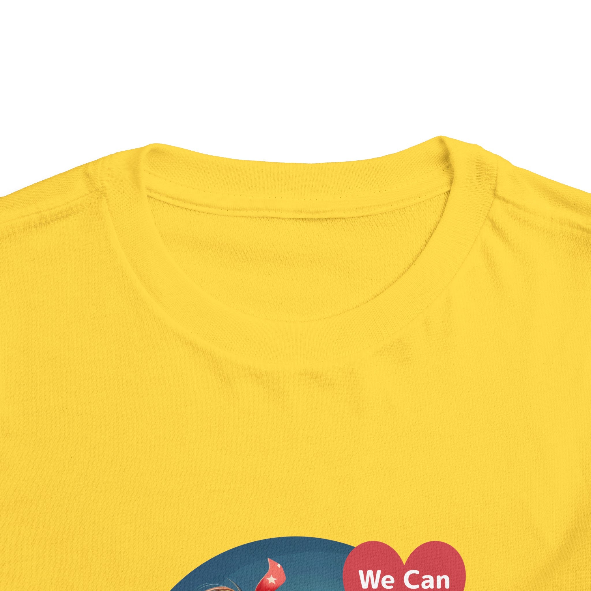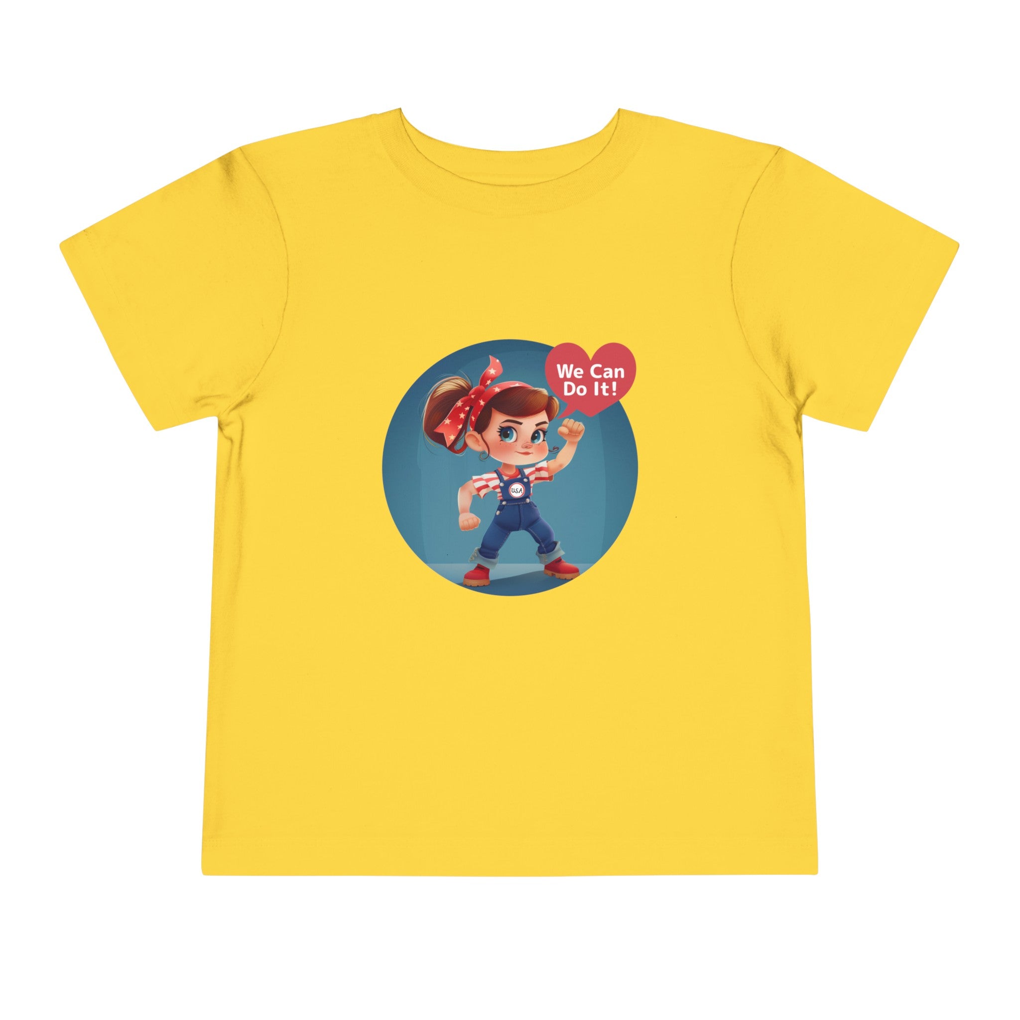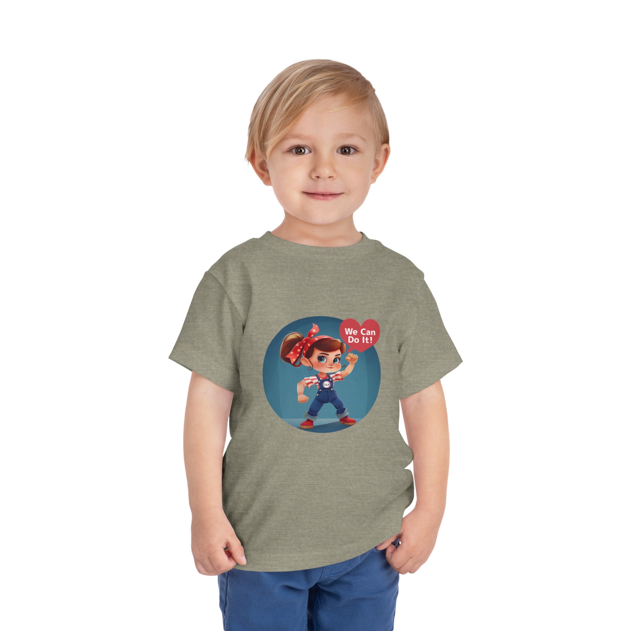 Elevate your toddler's wardrobe with our inspiring "We Can Do It!" Rosie The Riveter t-shirt. Made from the finest Bella Canvas materials, this short-sleeve tee is crafted from 100% Airlume combed and ring-spun cotton jersey in solid colors, ensuring softness and comfort for all-day wear. For heather colors, the tee is a blend of 52% cotton and 48% polyester, while the Athletic Heather variant offers 90% cotton and 10% polyester, all designed to maintain shape and durability.