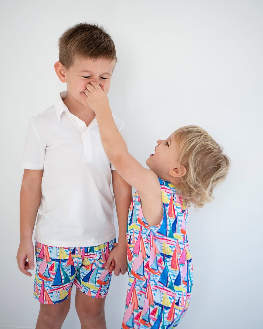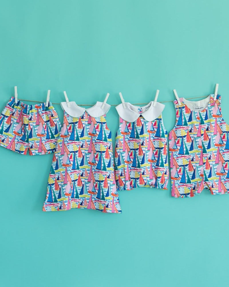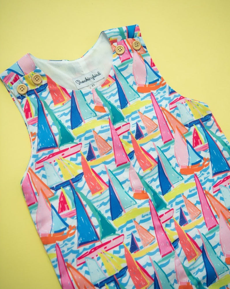 Our Sailing Soiree Shortall combines classic charm and practicality in one versatile piece. Featuring bold sailboat patterns, this shortall is crafted from soft, breathable fabric with buttoned shoulder straps for fuss-free dressing. Ideal for sunny days or seaside adventures, it pairs effortlessly with the Sailing Soiree Shorts for a coordinated sibling look.