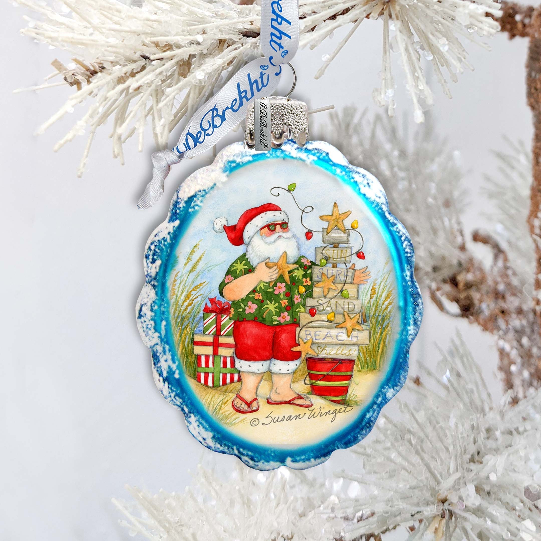 Brighten up your Christmas tree with this delightful Santa on the Beach Mercury Glass Ornament from S. Winget. This charming decoration features a Santa decorating beach Christmas tree, giving a touch of whimsy to your holiday display. This unique and elegant ornament makes memories and holiday cheer last for years.