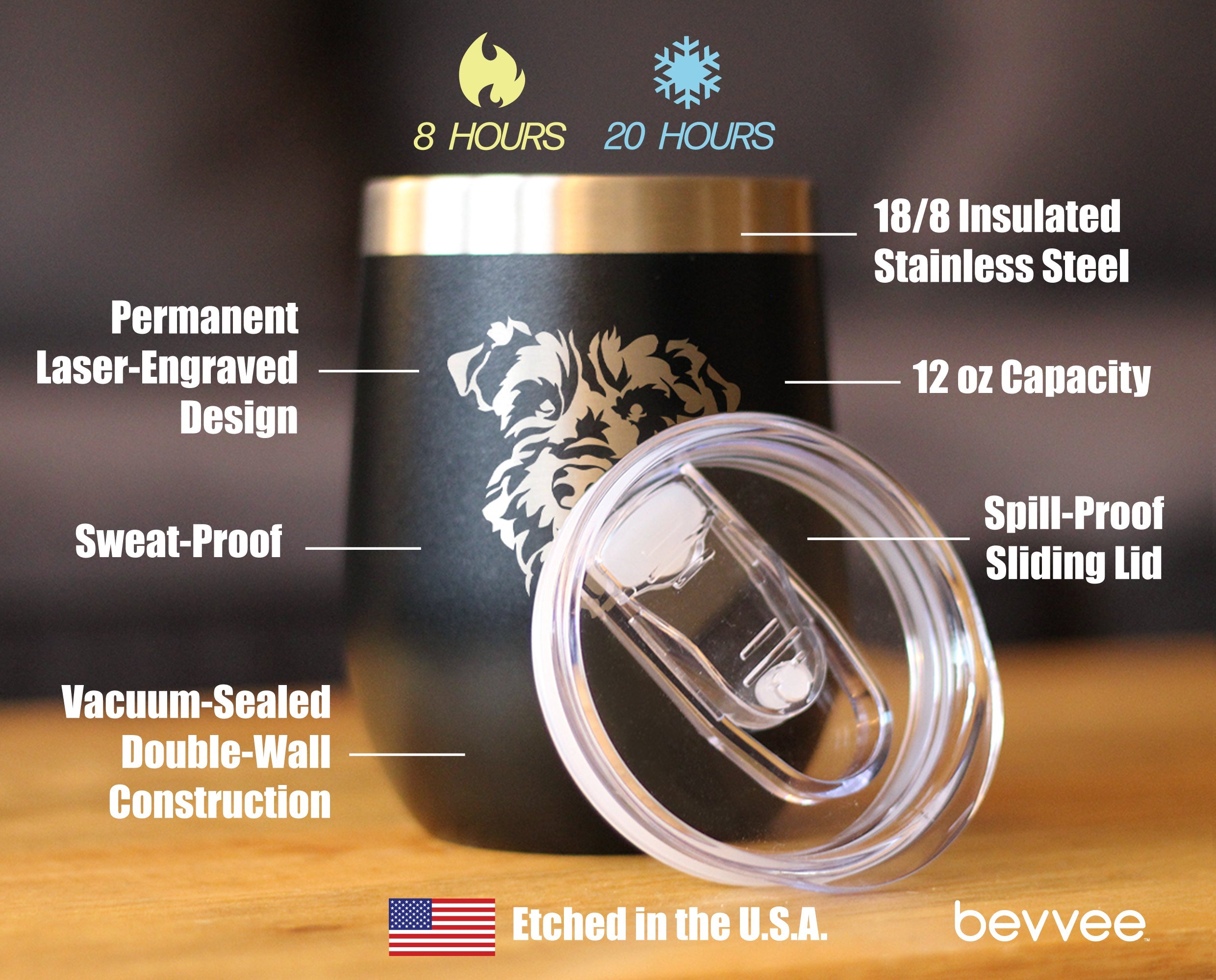 Our 12oz. stemless wine tumblers with sliding lids feature stainless steel double-wall construction, vacuum insulated for 2X cold and heat retention compared to glass or plastic containers! Etched in America.