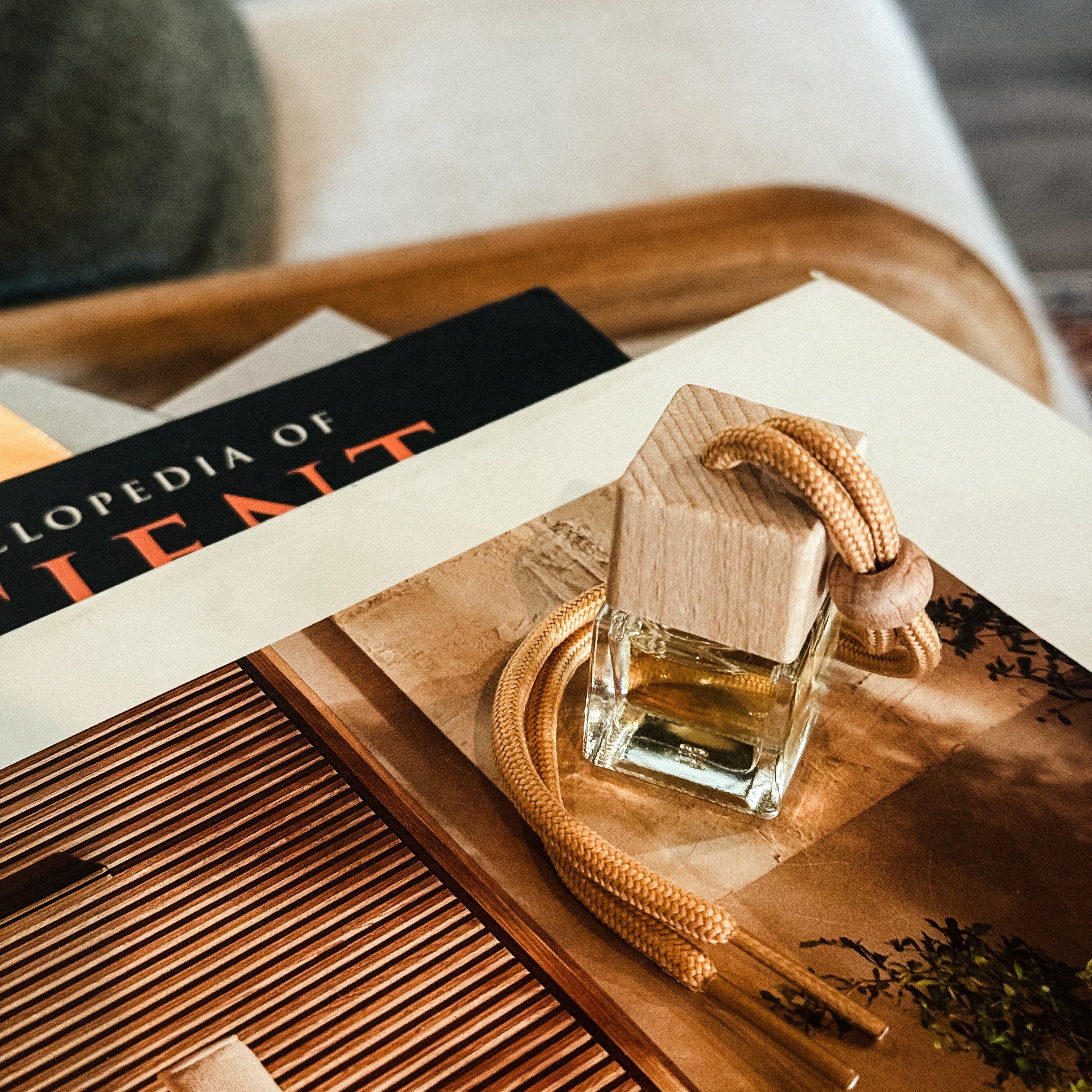Remove plastic plug under the wooden lid, replace the wooden lid, slightly tilt diffuser for a few seconds for oils to soak into lid & rope. Hang & enjoy!