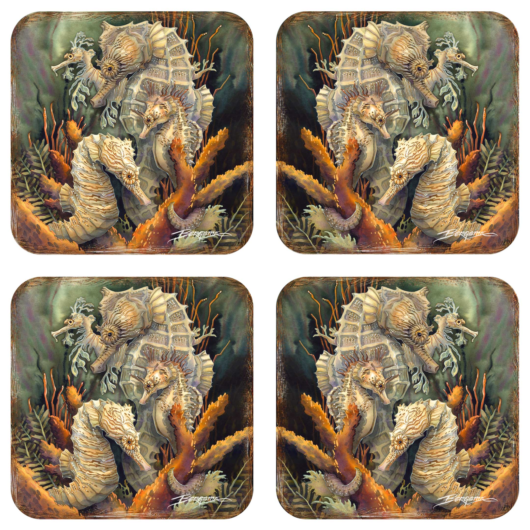 Seahorse Family Wooden Cork Coasters Gift Set of 4 by J. Bergsma - Coastal Decor - 8199454C-S4