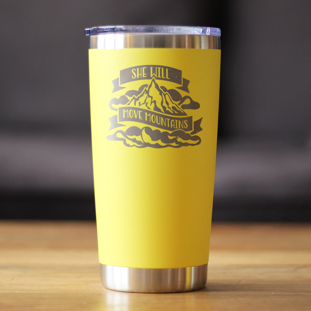 She Will Move Mountains - Insulated Coffee Tumbler Cup with Sliding Lid - Stainless Steel Insulated Mug - Motivational Inspirational Gifts for Women ‐ Yellow