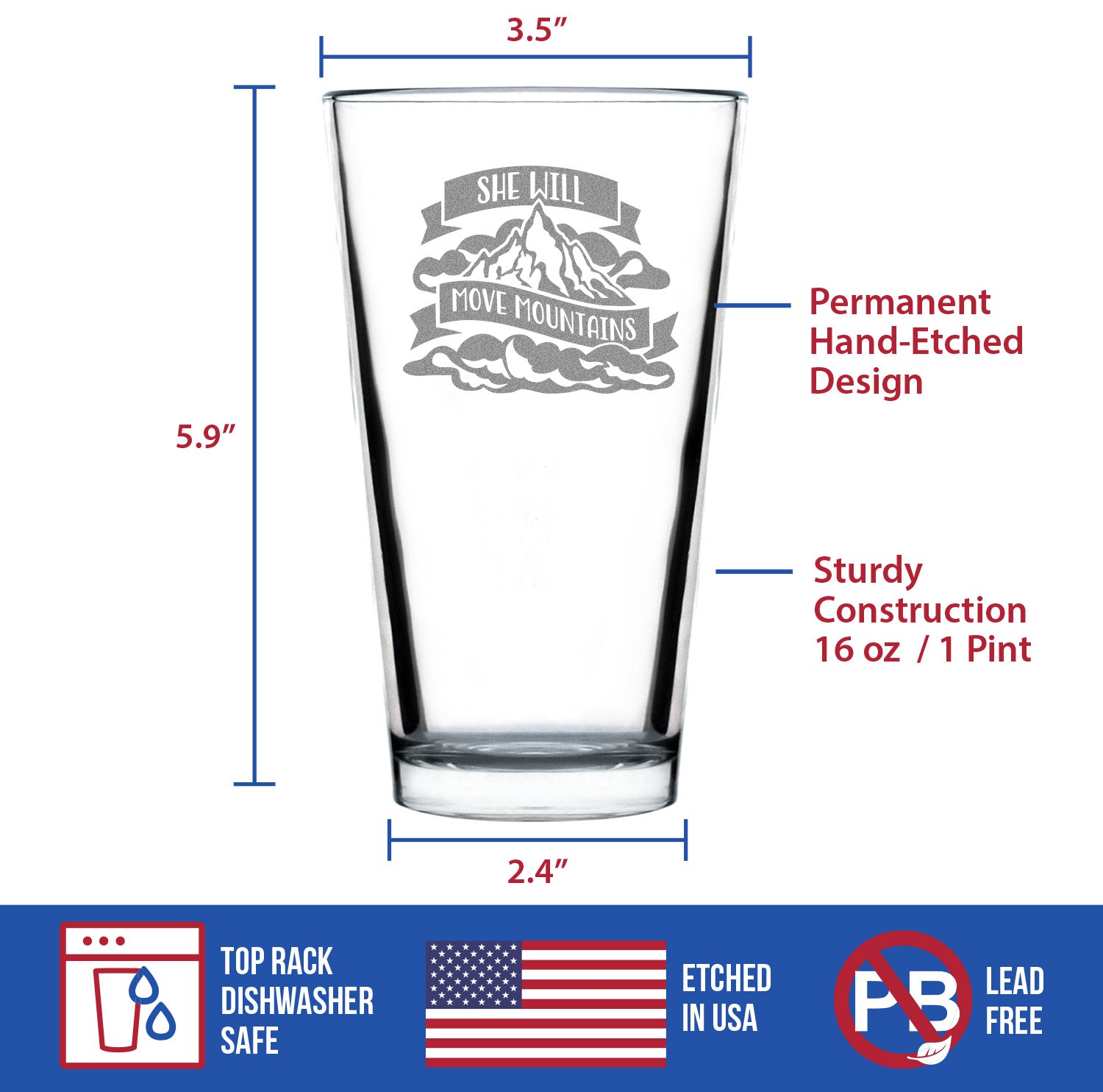 She Will Move Mountains - Pint Glass for Beer - Inspirational Gifts for Women - 16 oz Glasses