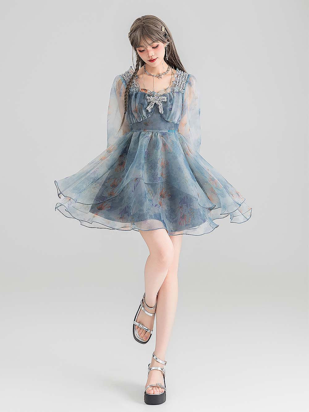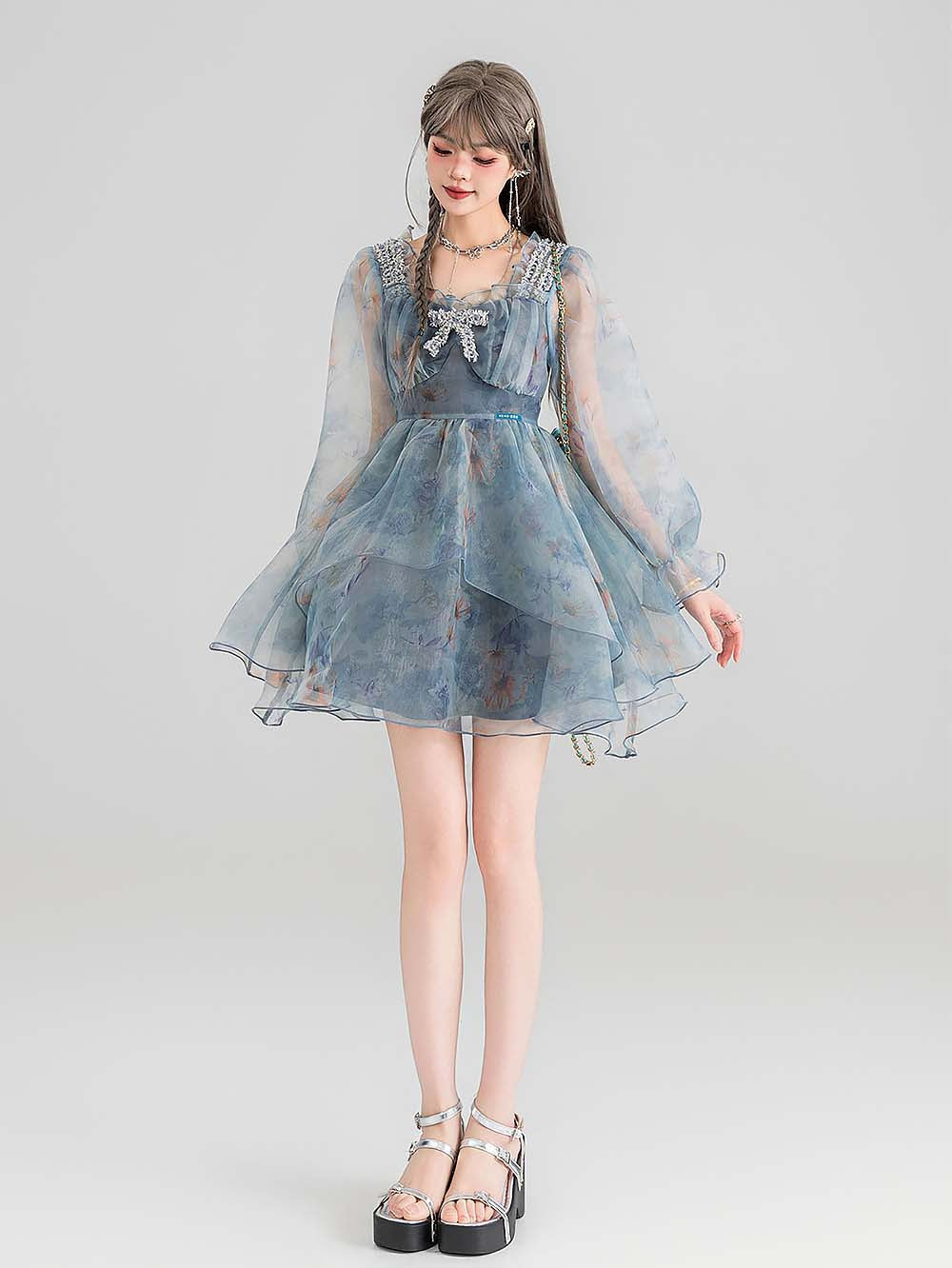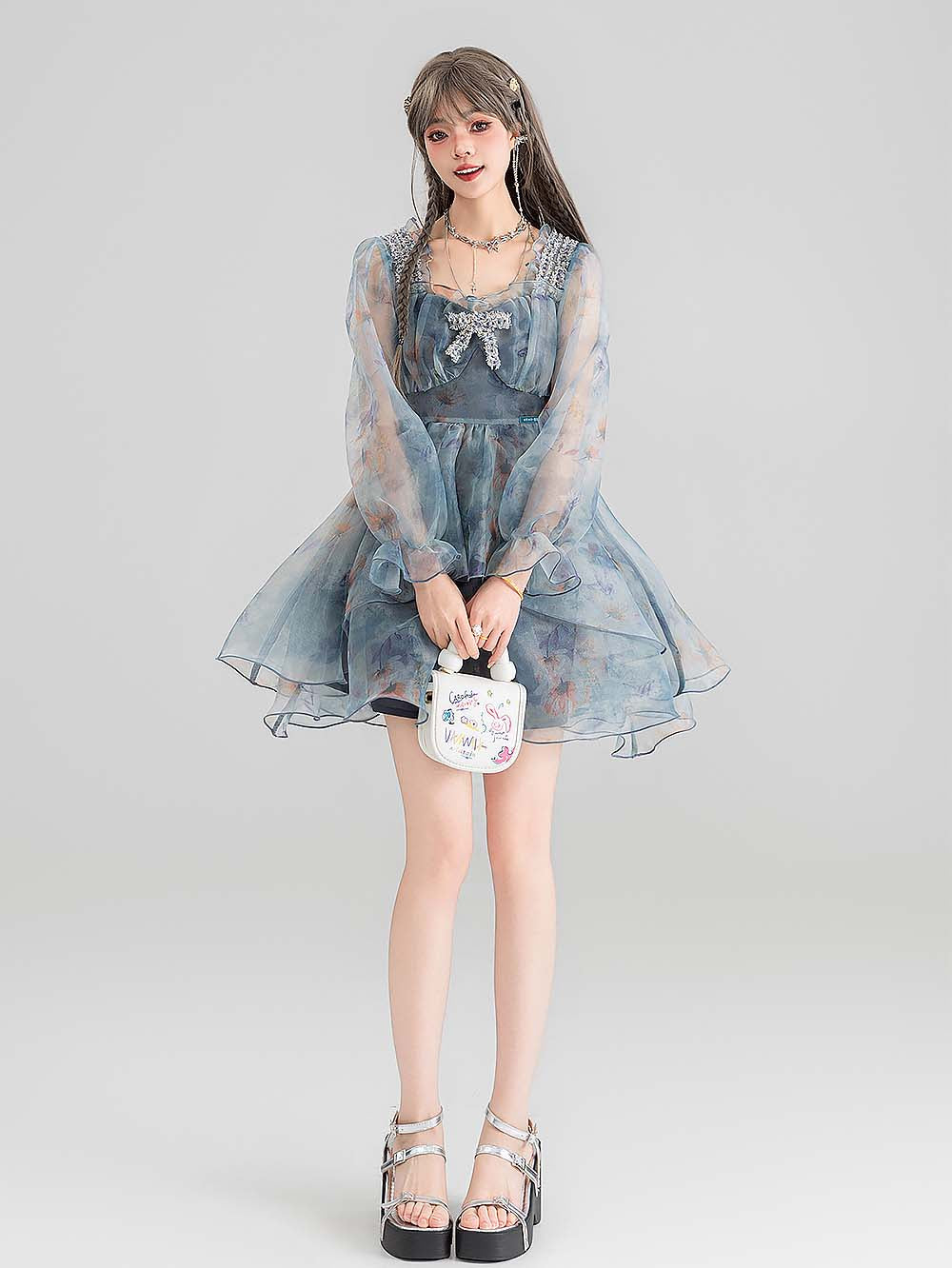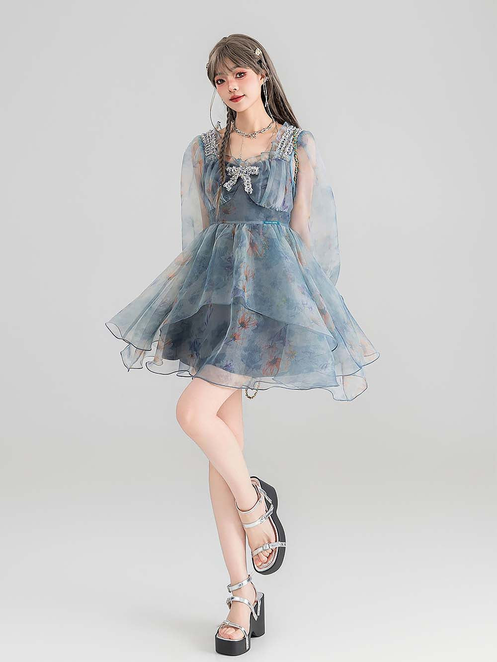 Smoky Blue Floral Princess Dress | ZAKAPOP ‐ Long Sleeve / S
