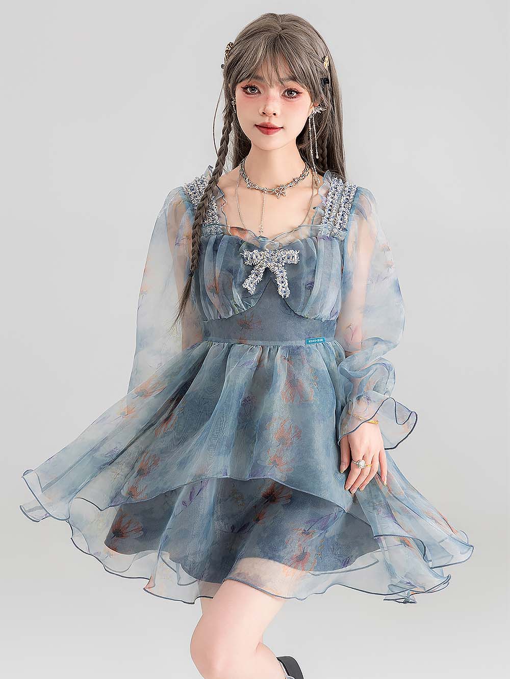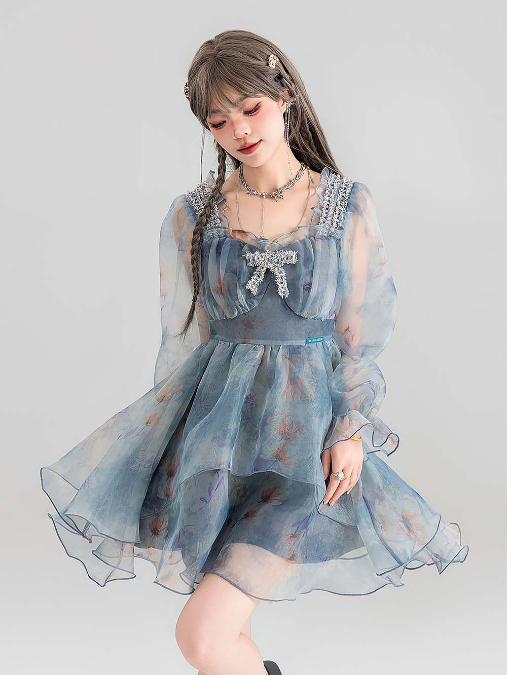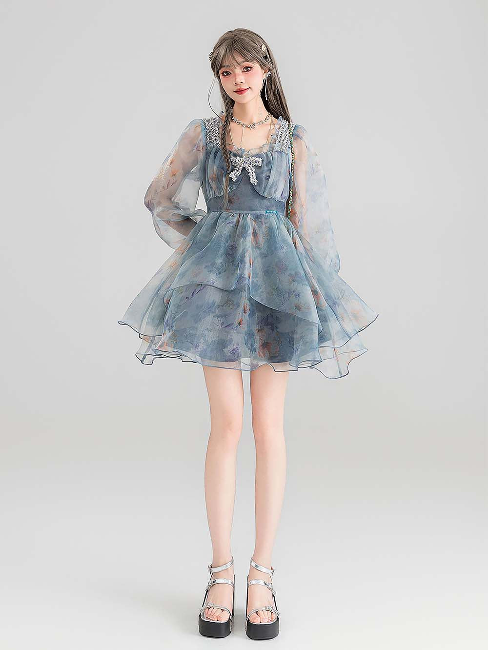 Smoky Blue Floral Princess Dress | ZAKAPOP ‐ Long Sleeve / S