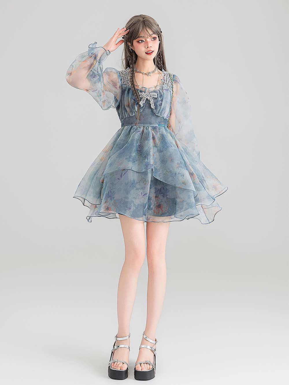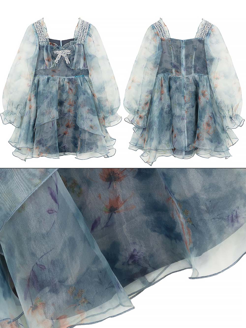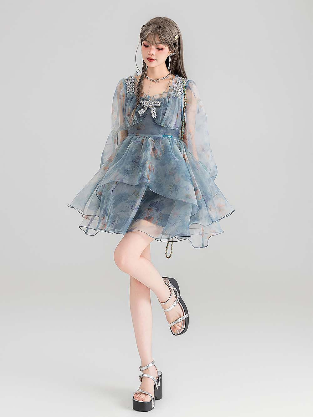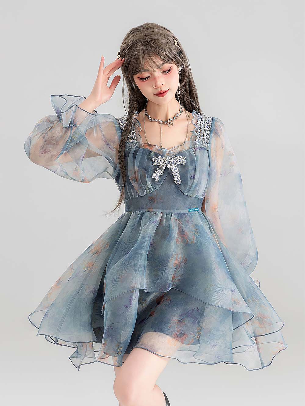 Smoky Blue Floral Princess Dress | ZAKAPOP ‐ Long Sleeve / S
