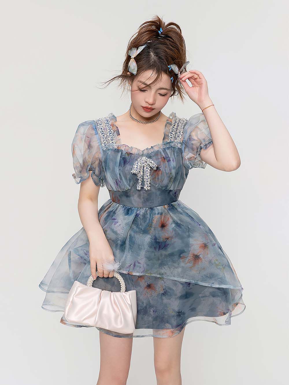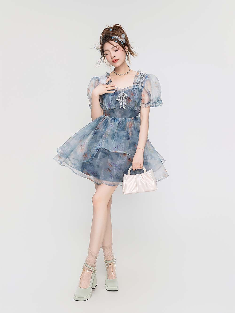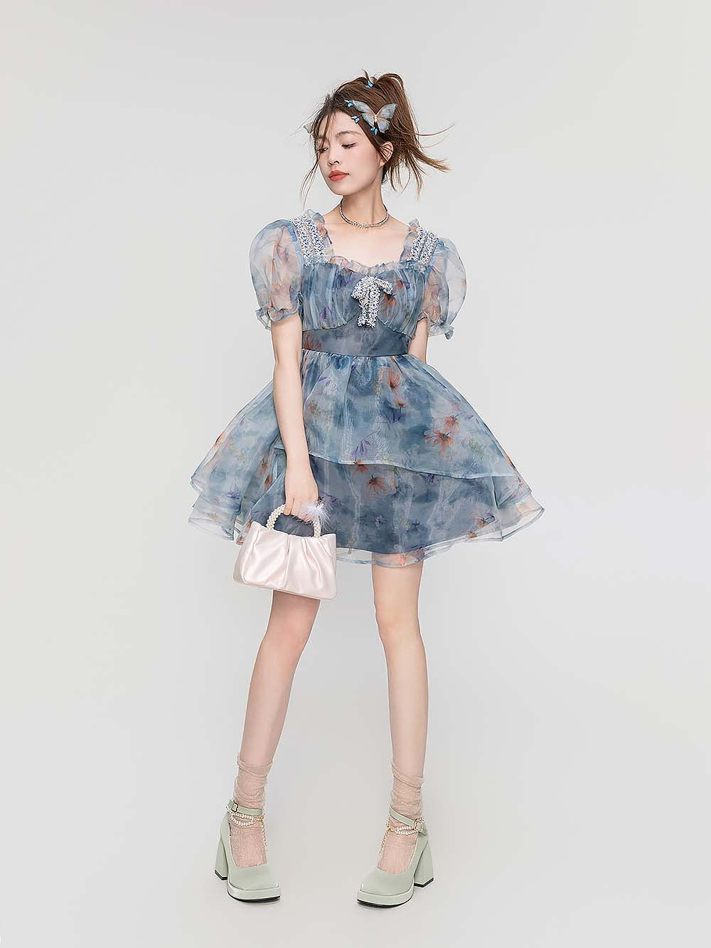 Smoky Blue Floral Princess Dress | ZAKAPOP ‐ Short Sleeve / S