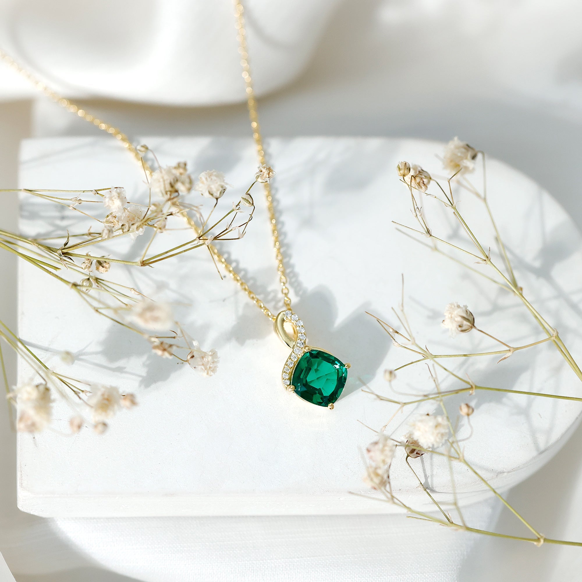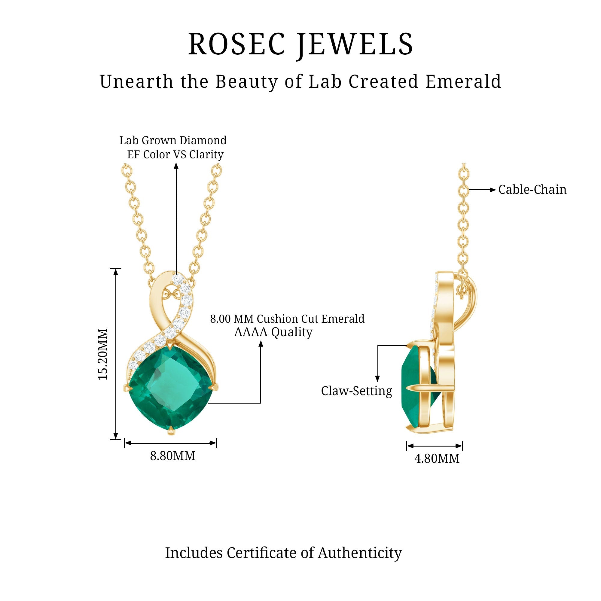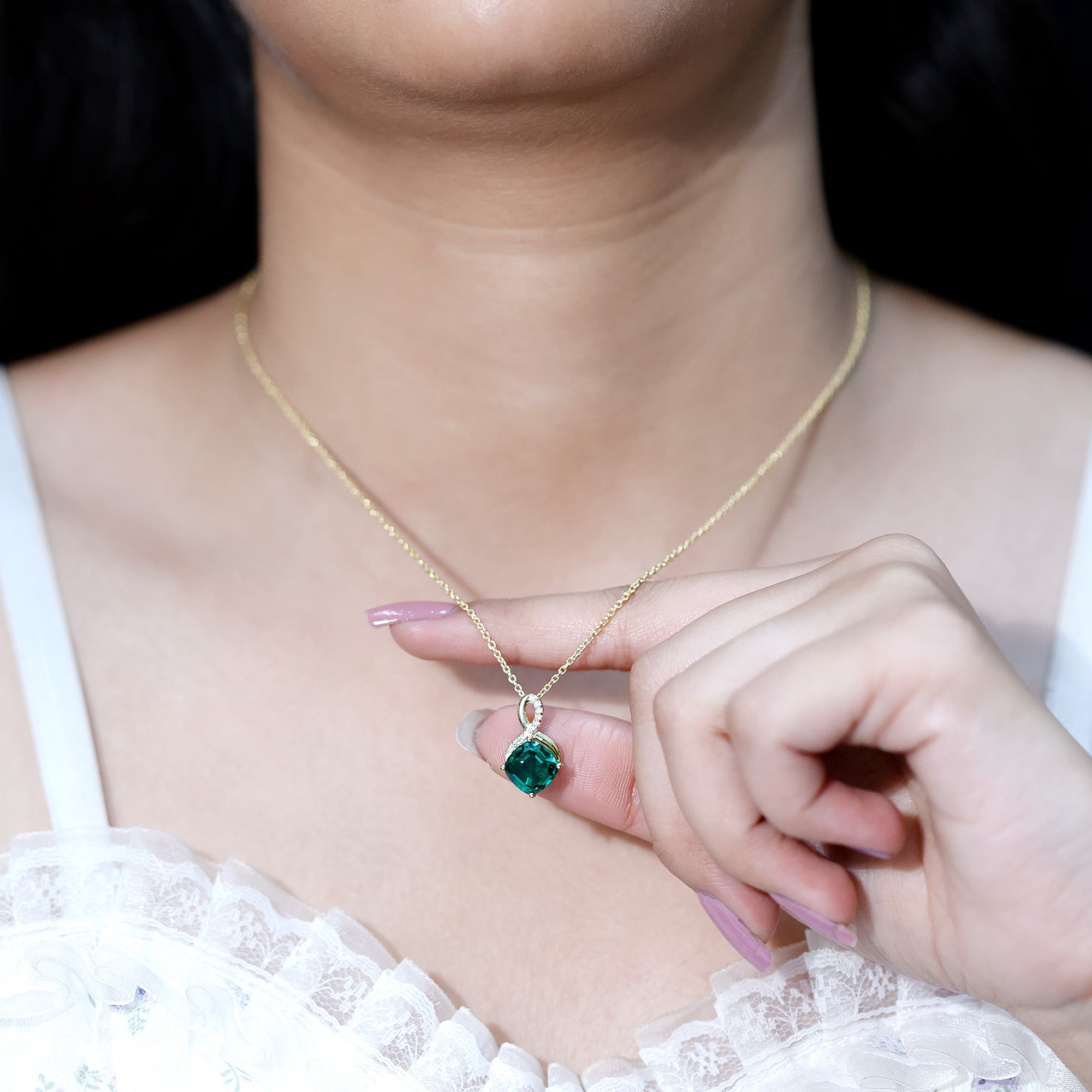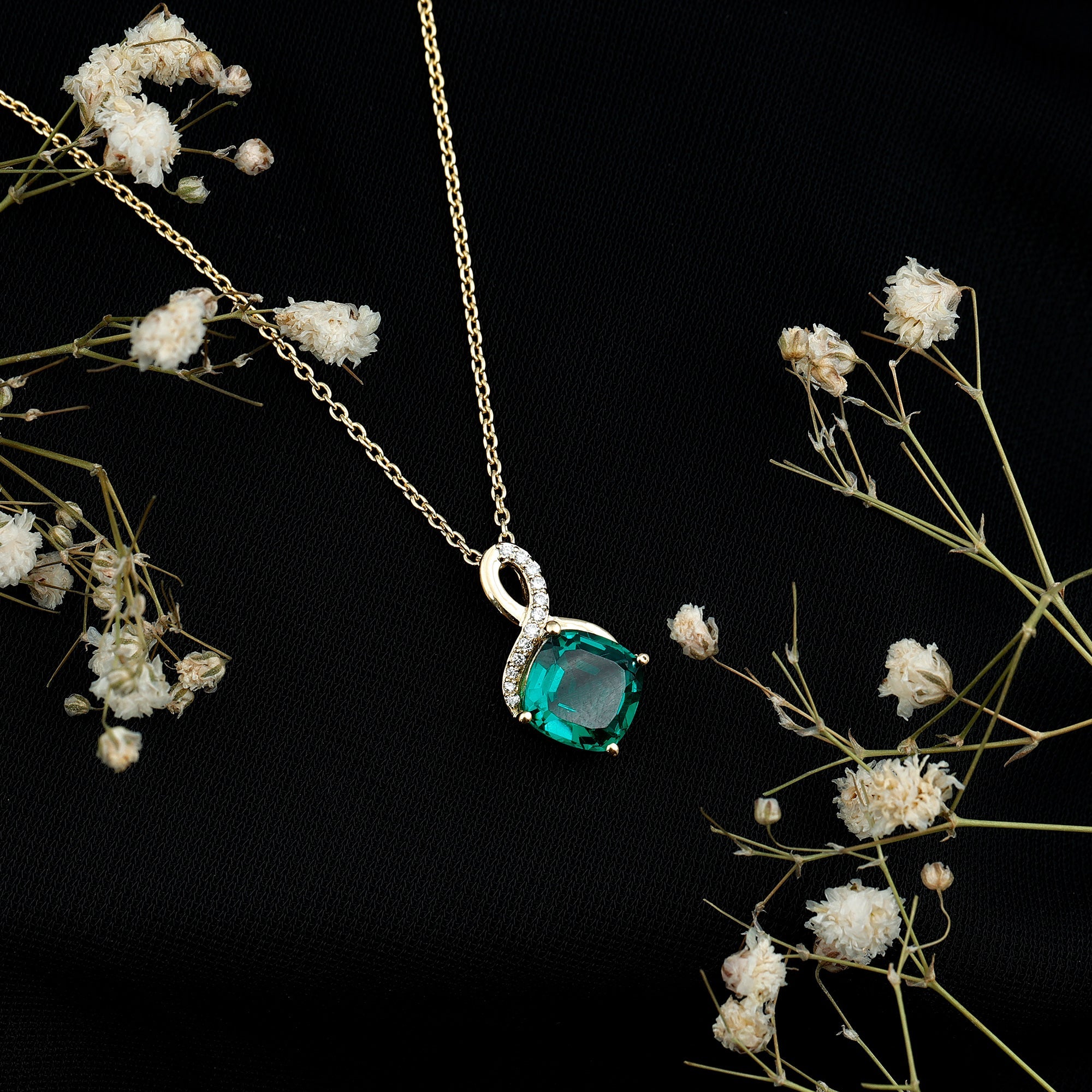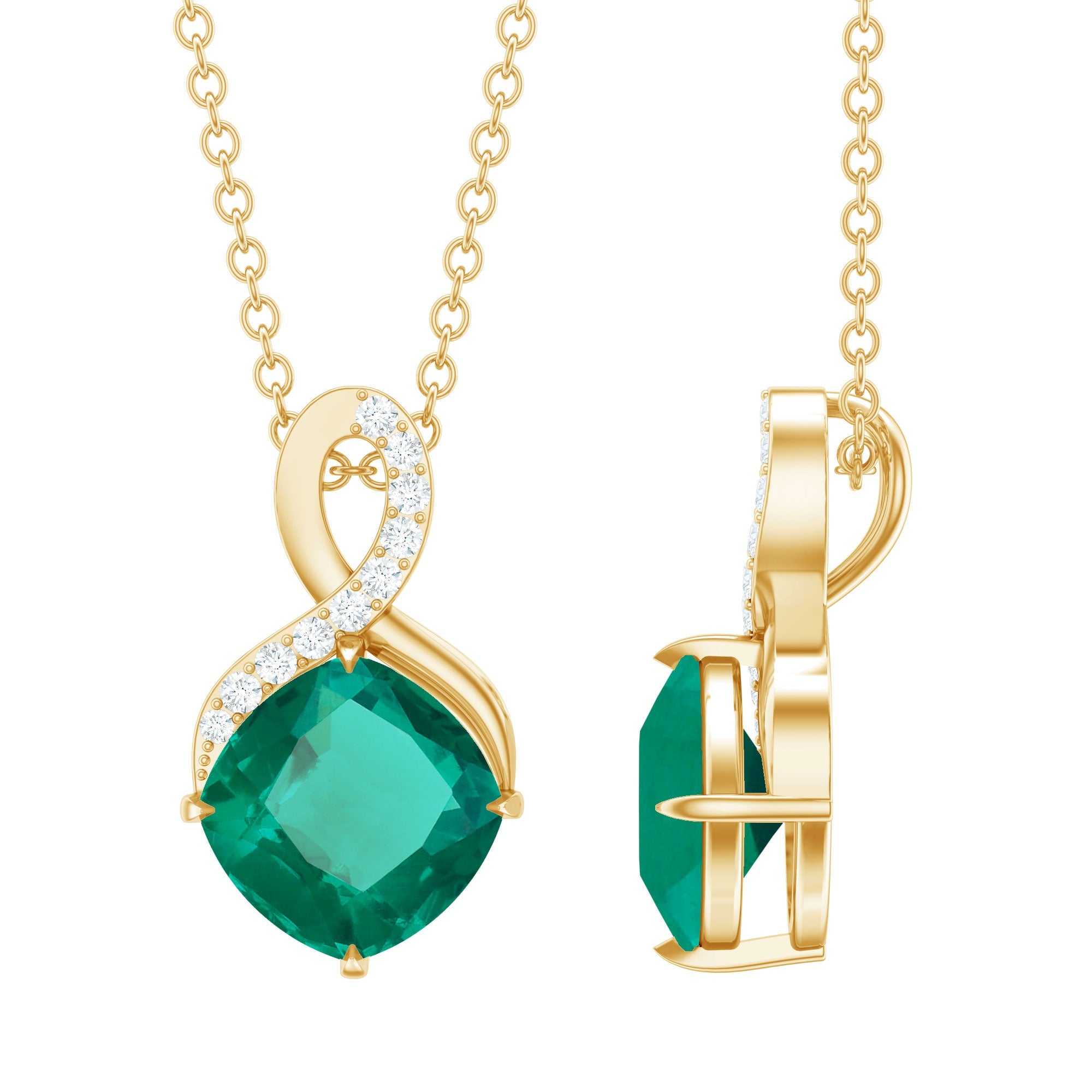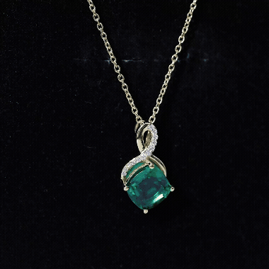 Carefully handcrafted in yellow gold plated silver, this striking piece features a rich 8 MM cushion cut lab grown emerald held in secure prong setting. Above the center stone, a delicate infinity symbol sparkles with lab grown diamonds, representing forever love and unbreakable bonds. The elegant design flows effortlessly from a cable chain, making this Emerald and Diamond Pendant perfect for layering or wearing on its own for everyday sophistication. Whether you are dressing for a special occasion or adding something meaningful to your daily look, this Infinity Pendant Necklace blends timeless symbolism with contemporary style in the most graceful way. The AAAA quality lab grown emerald and EF-VS quality lab grown diamonds offer exceptional sparkle and clarity, while being ethically made and environmentally friendly, making it a conscious and beautiful choice. This Emerald Pendant Necklace is not only a symbol of love but also a reminder of personal growth, inner peace, and strength, making it an ideal gift for birthdays, anniversaries, or simply a thoughtful self-purchase.